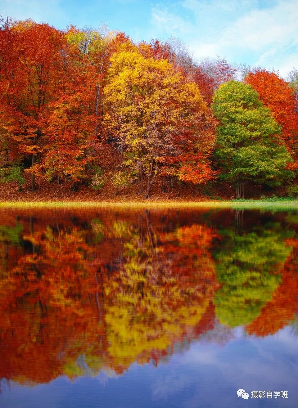 同时,还要选择一些角度,比如拍水边的树林,不带水拍摄,只是站着拍两排树,没啥意思,但你要走到岸边,用水拍出树还有蓝天的倒影,秋景照片就更美了。