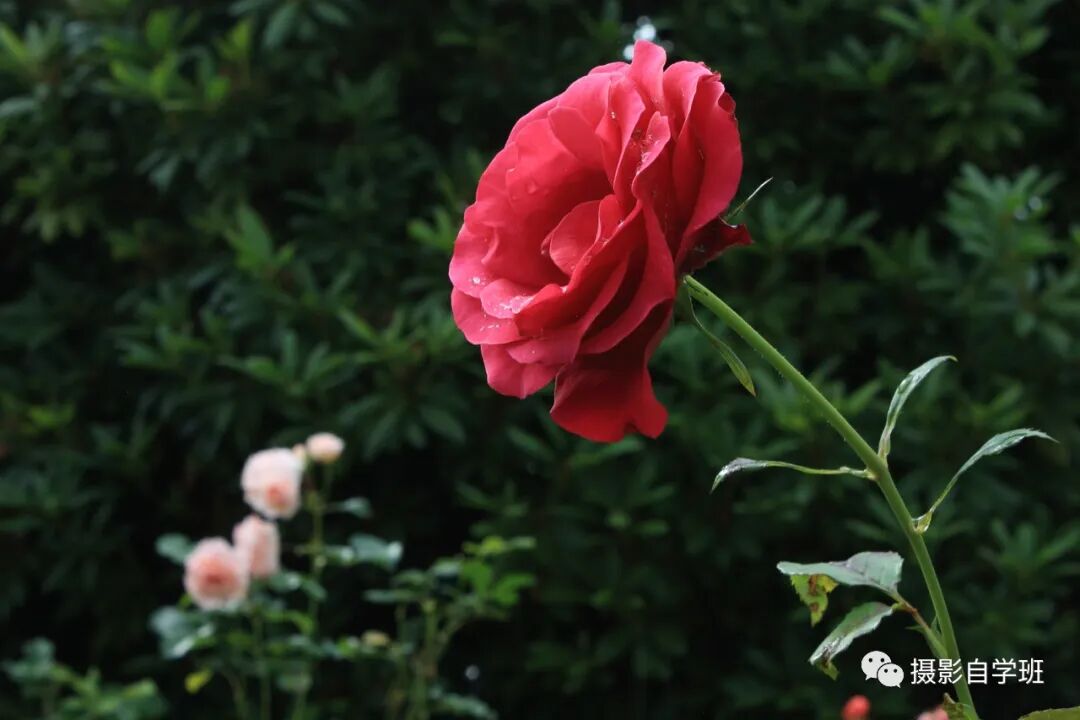 还可以像图5这样,利用颜色对比,来突出主体,图5当中背景是被调成了深绿色,前景有淡淡的浅绿色,但也已经形成了很好的虚化,红色的花朵只有一朵,颜色非常突出,通过颜色对比,照片形成了很好的主次对比。