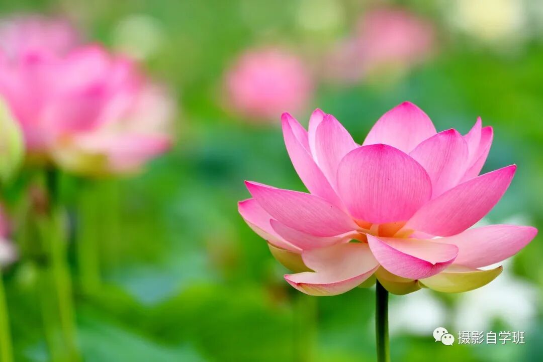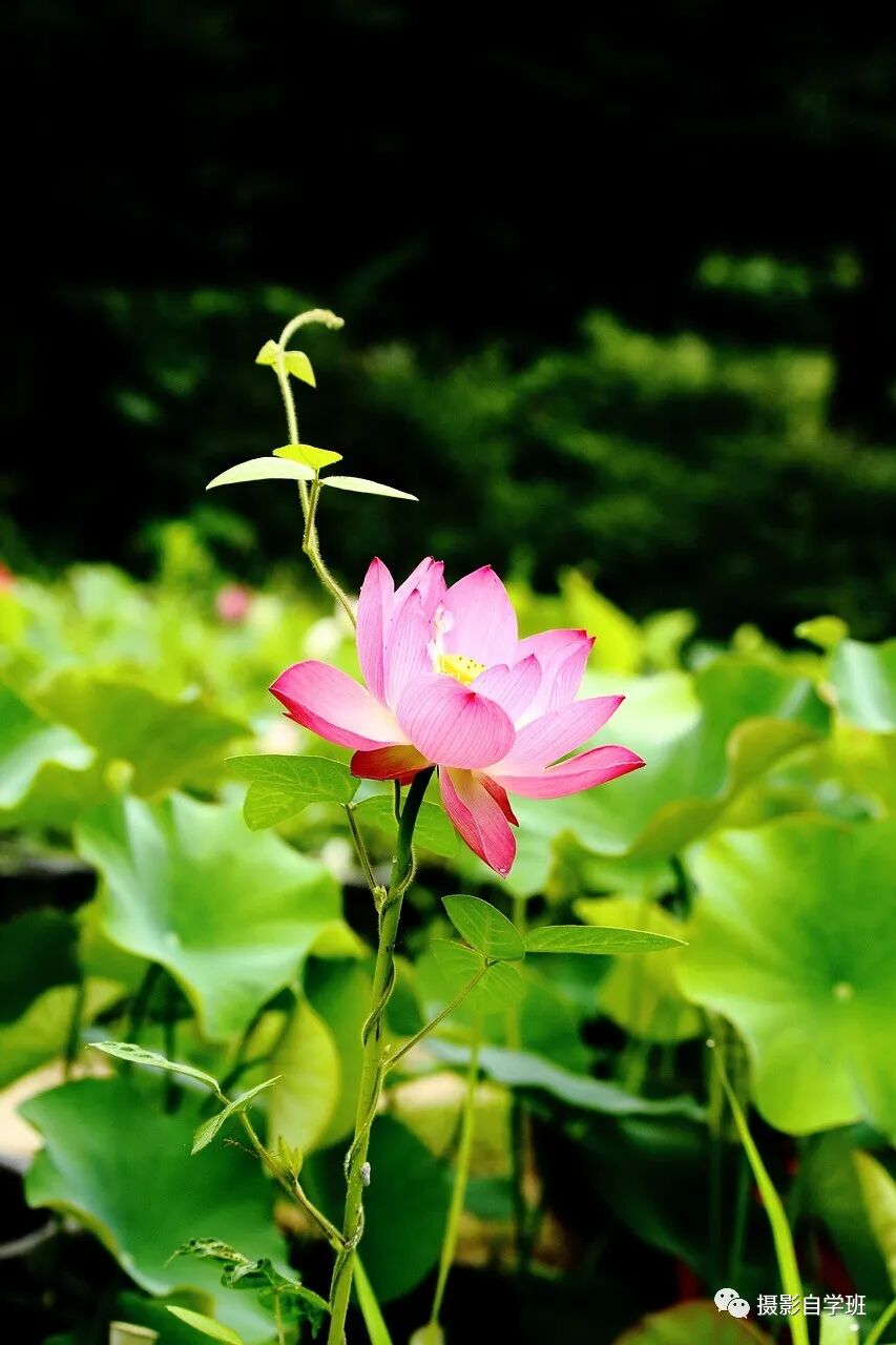 选择一个角度,让你被拍的主体荷花远处有一朵荷花,这样即使没有大光圈,背景荷花离得远,也能被拍得很虚化,虚实对比就有了。