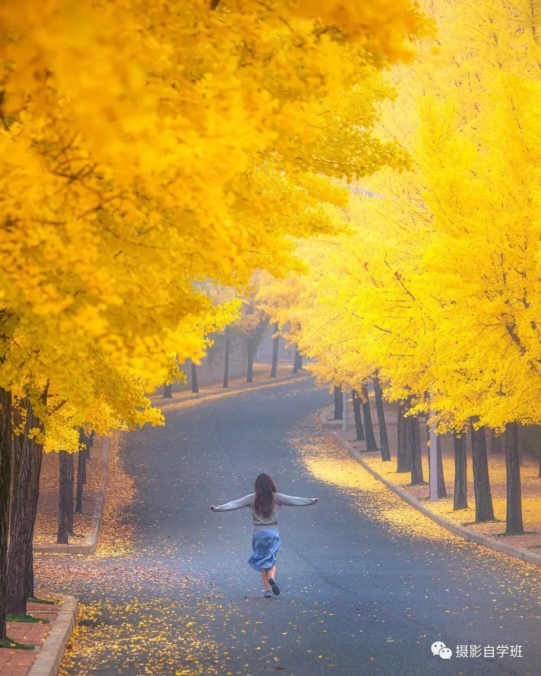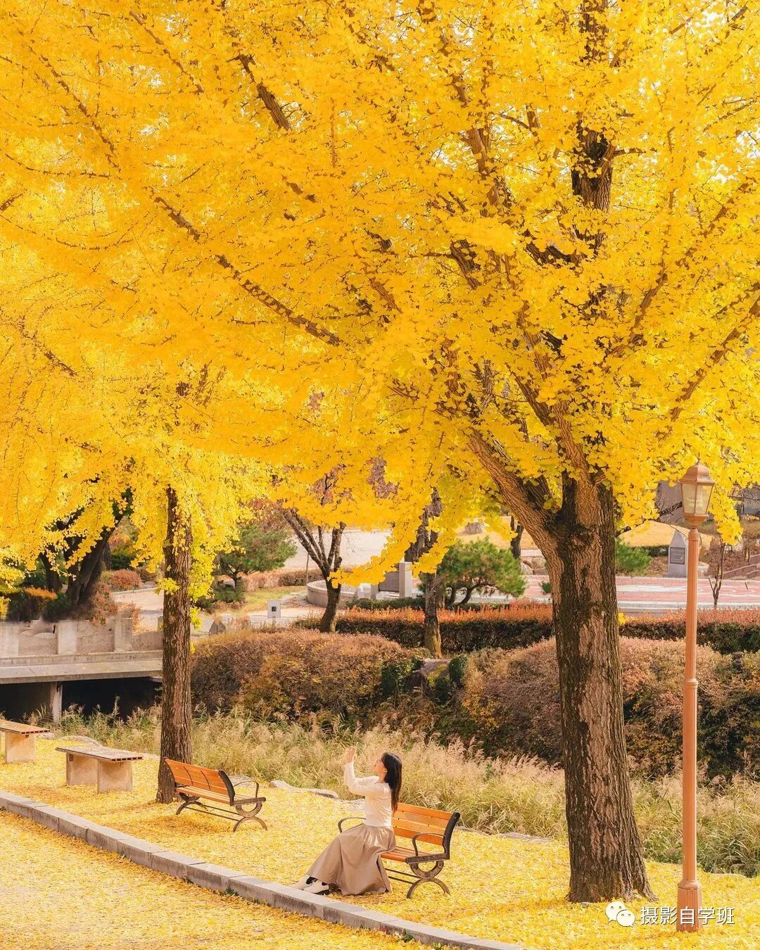 并且还要安排颜色差别,周围的景色,都是黄色的,树叶非常漂亮,人如果穿着一个有差别颜色的衣服,就会起到很好的点缀作用,周围的风景,也会起到更好的陪衬作用,互相加分。
