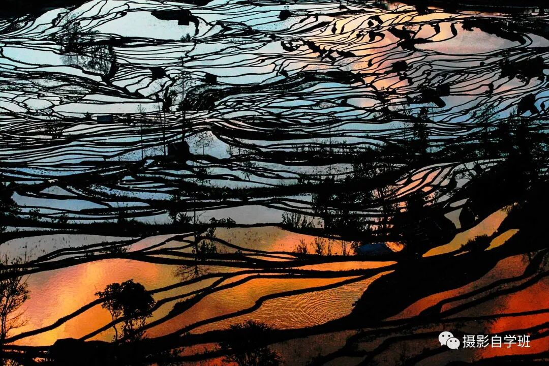 有些风景在不同的时间段,会呈现出不同的色彩,所以你在训练是有思维的时候,要学会选择时间,比如图4这张照片,如果天是蓝的,那下面的水面,也是蓝的,如果天上有晚霞,那水面,就像调色盘一样,五彩缤纷,更加漂亮了。