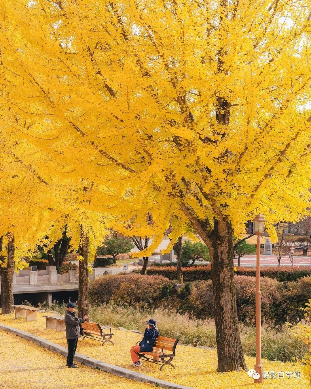比如与图2与图3这两张照片,大树以及树下的落叶,都非常漂亮,此时就需要等待画面当中出现一个人了,图2等来了一位女士,拿着手机,仰拍上方的树叶,图3等来了两位老人。
