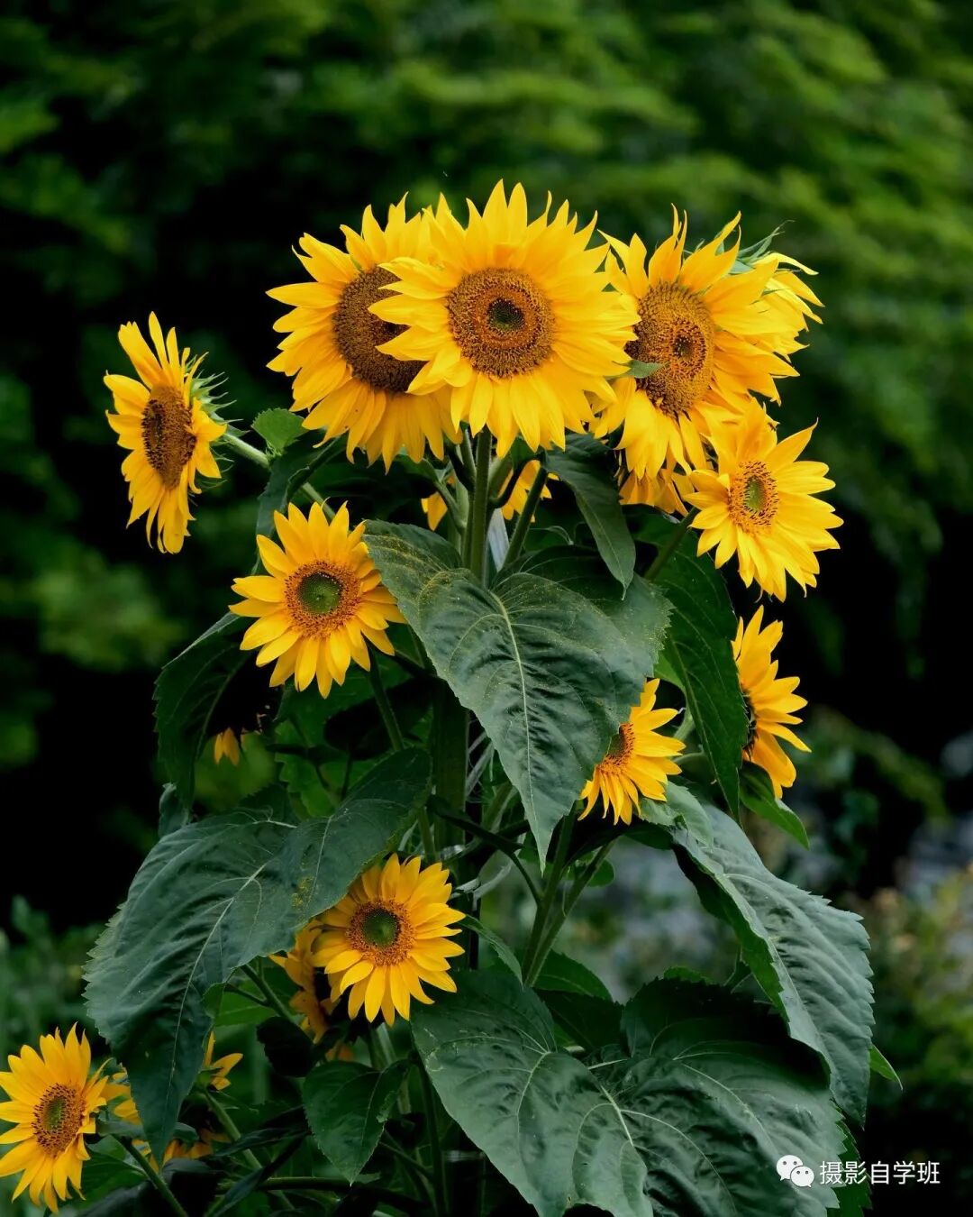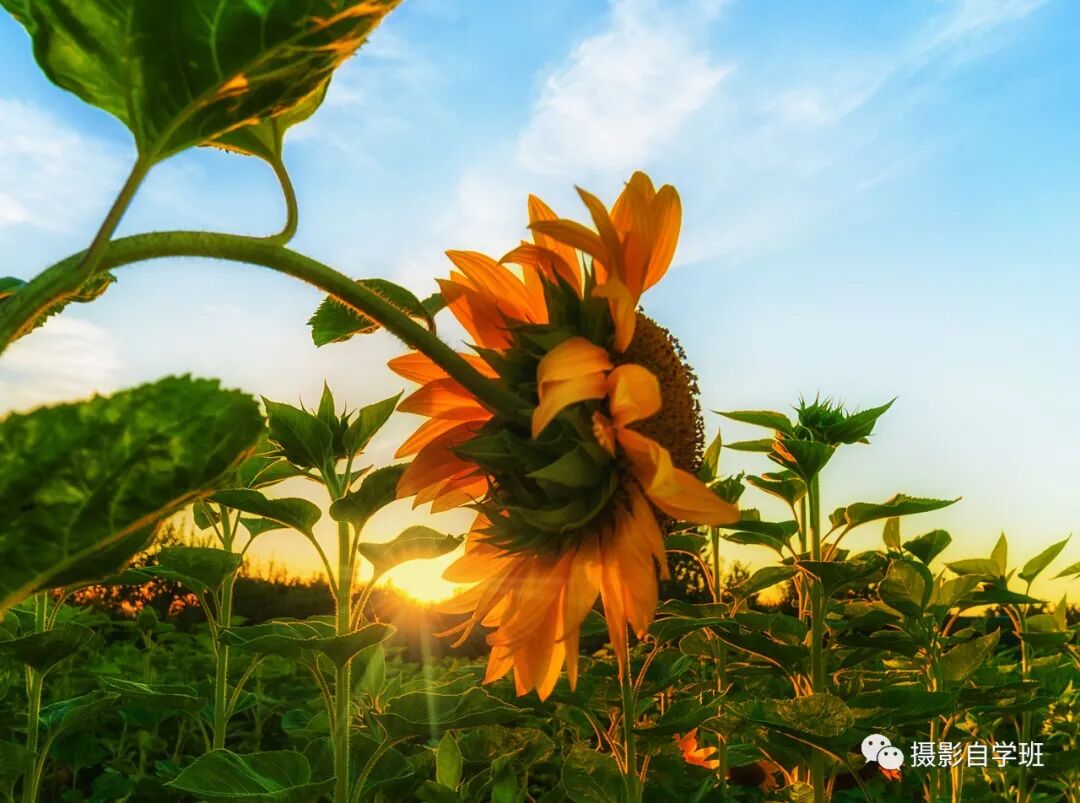 逆光方向,等待光线出现在向日葵缝隙处,从你向日葵的缝隙,漏进来光,调小光圈,就能拍到图1和图2这样的星芒光了。但后期需要把向日葵花朵提亮。
