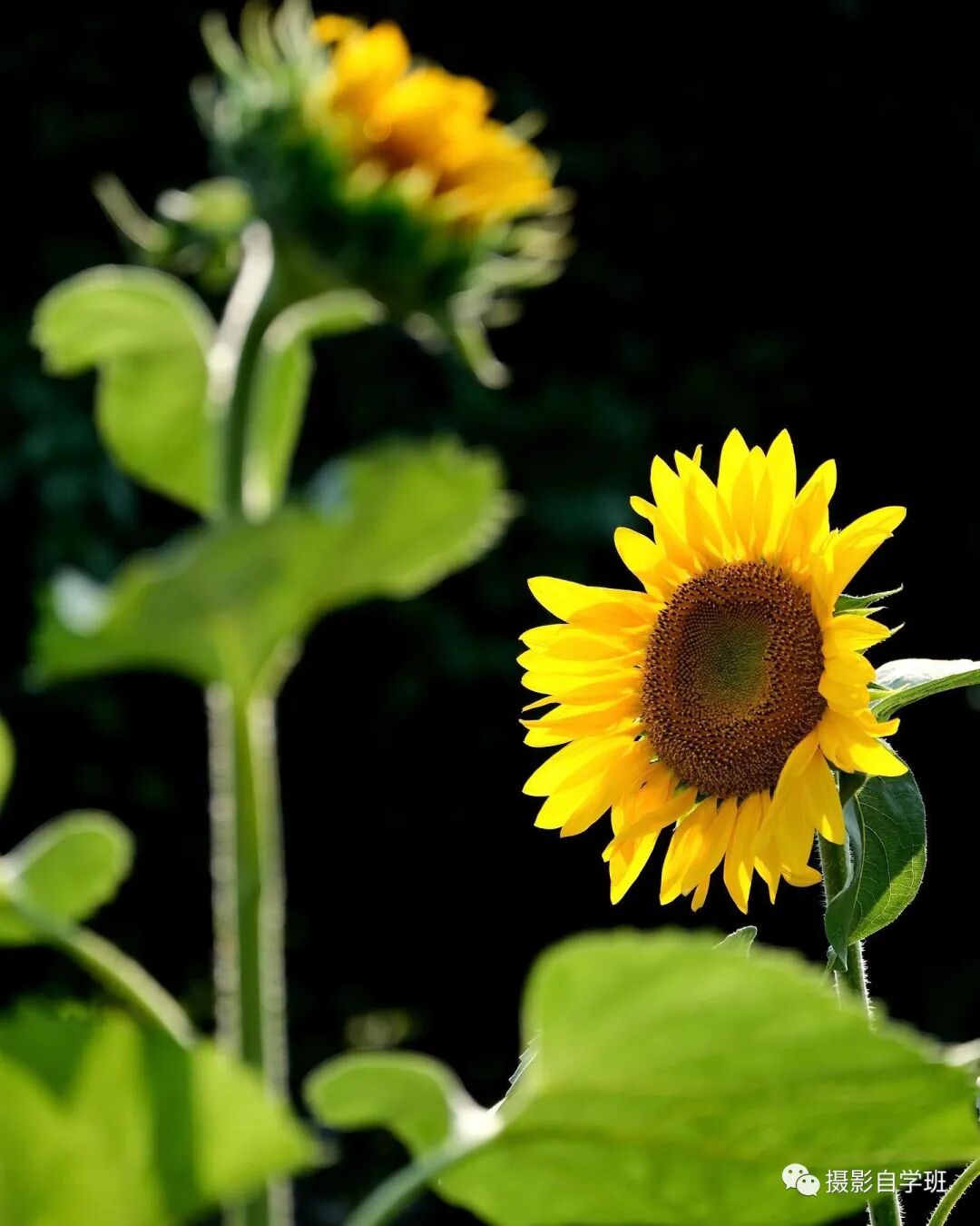 向日葵的颜色比较鲜艳,容易让照片看起来混乱。在拍摄时可以使用对比来增加照片的层次感。可以选择在花瓣和叶子之间寻找对比。