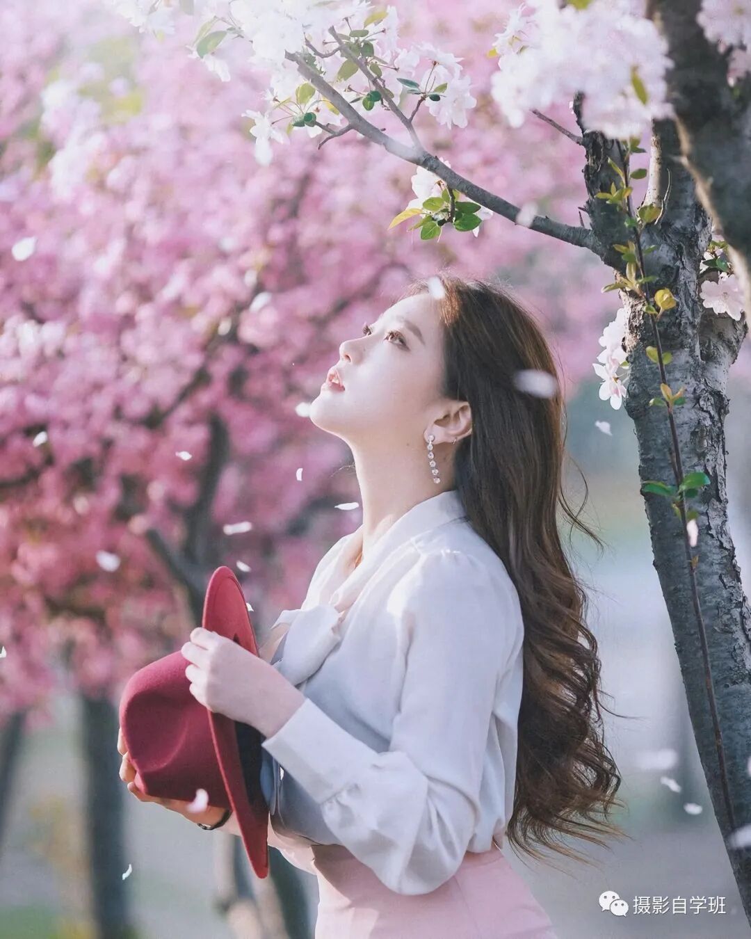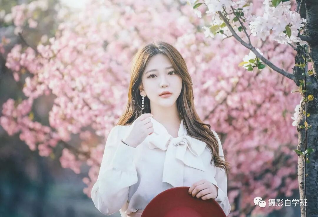在树下拍摄时,如果想要让照片看起来更加浪漫,那就要注意等来风了,有风吹过,树上的花瓣就会散落,像图10与图11这样,想拍出好看的画面,还要找准光的方向,图9的光,就比较平,人正对着镜头,人的形态也比较平,而同时这张侧面来的光线,让人的面庞更加明朗、清晰。侧身拍摄,让人的立体感、轮廓感更强,图11人的脸迎向上方的光线,脸部明亮,拿着的帽子,是红色的,与背景的粉色,在同一色系。