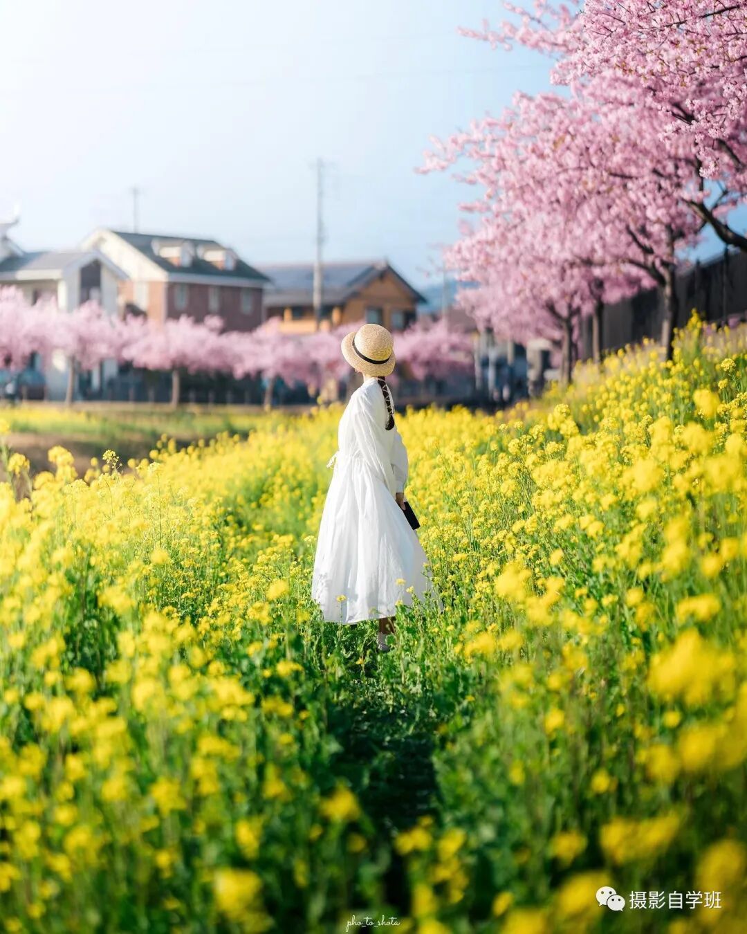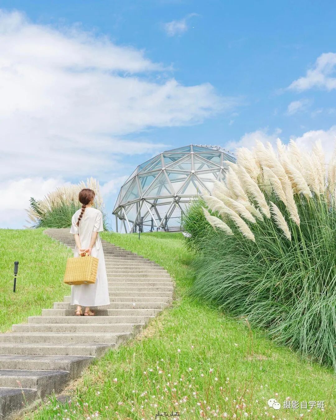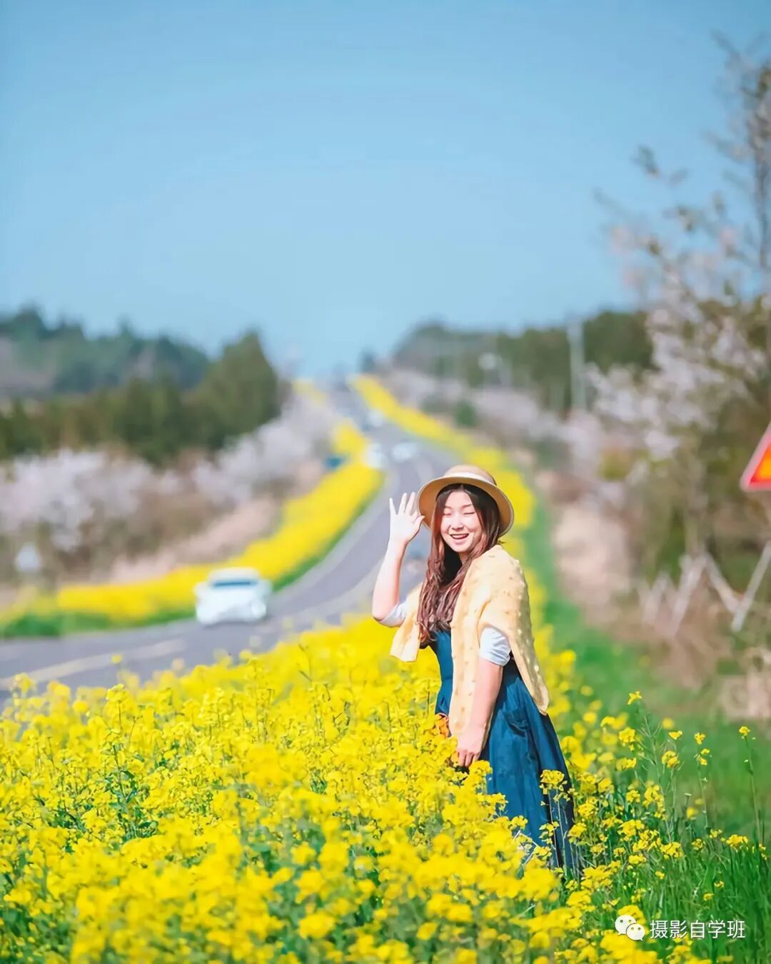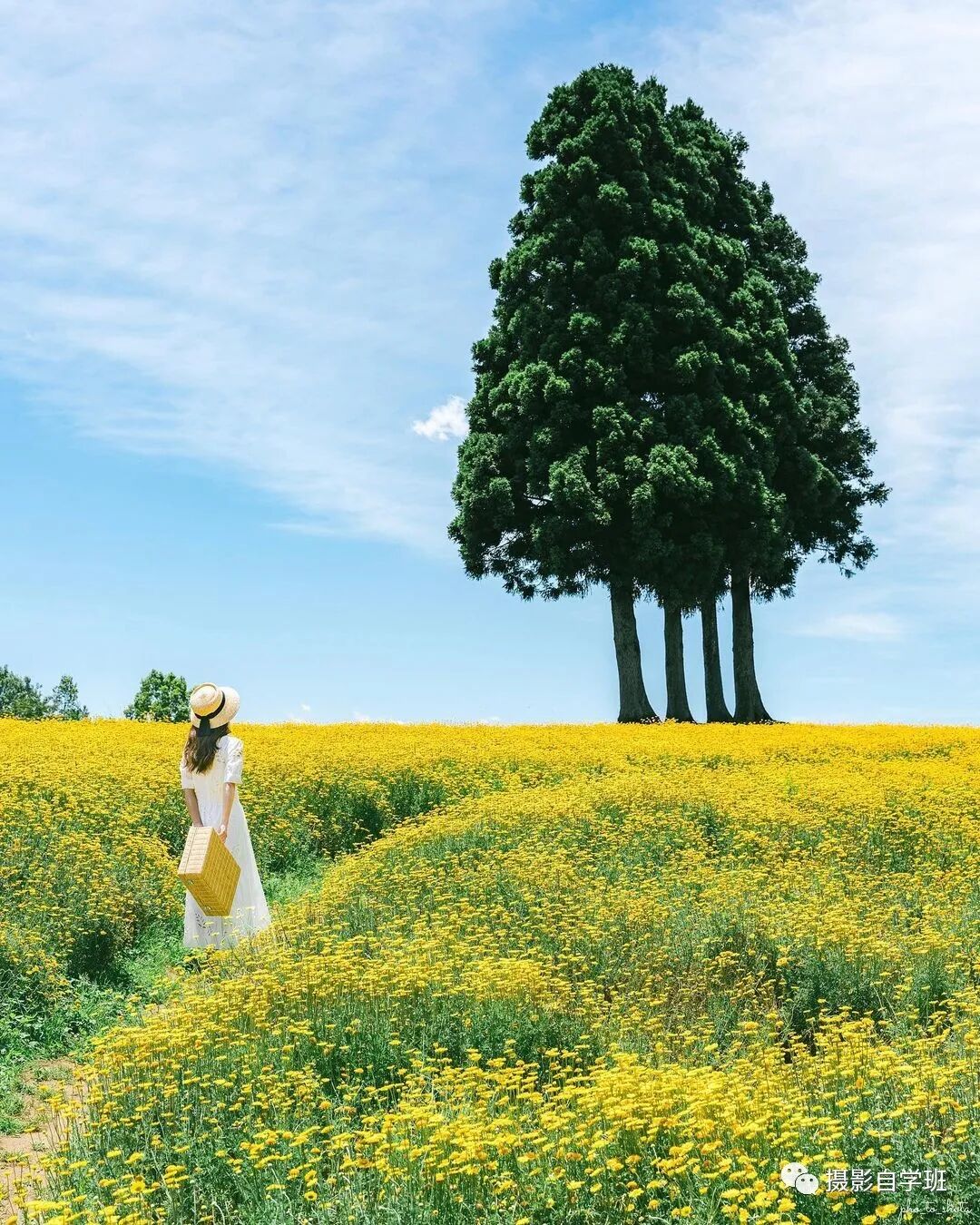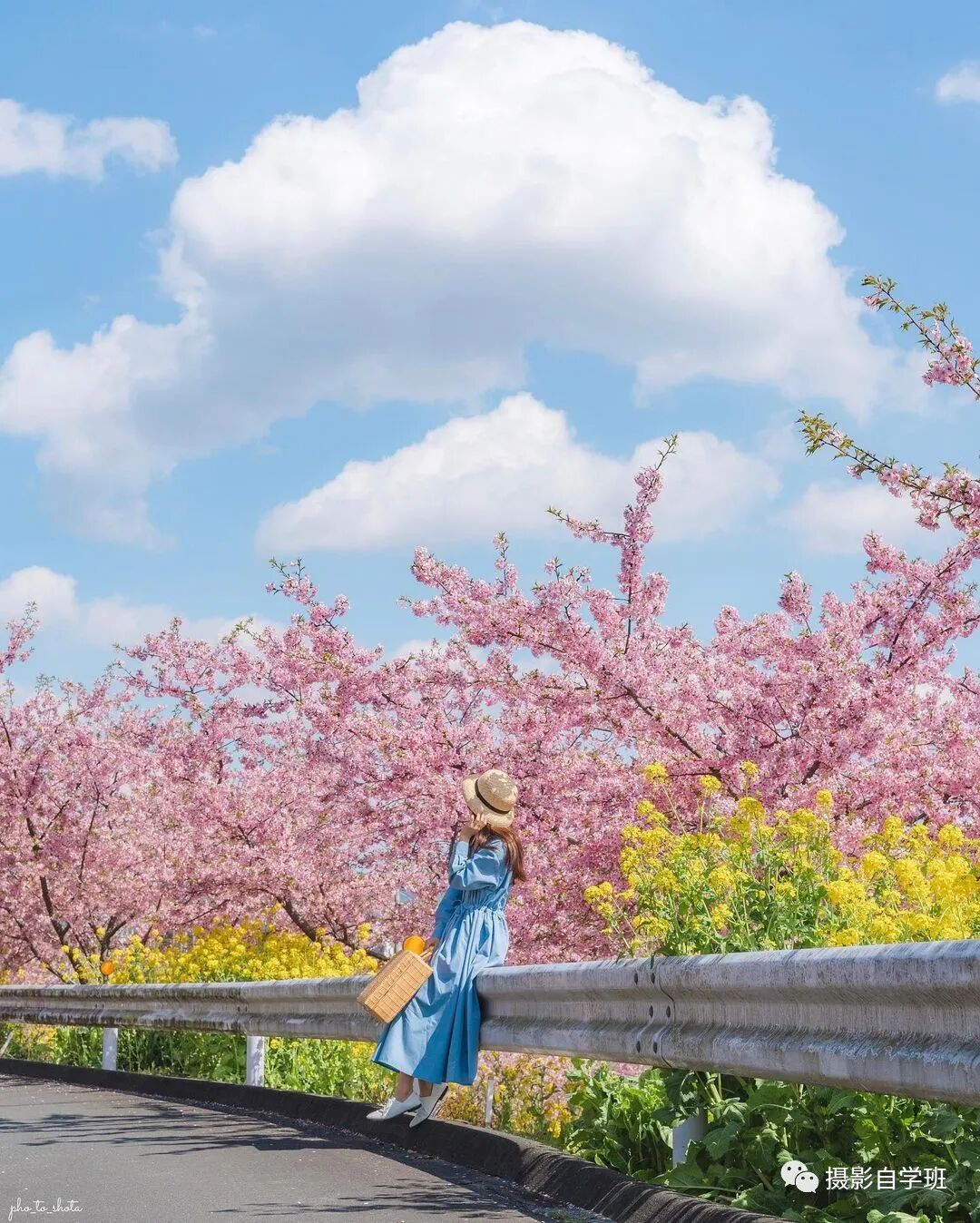 如果拍摄的场景,像图1与图2这样,非常美观,颜色又不是过于杂乱,就不适合把人拍得太大,把景拍得太小了,而应该让风景更大一点,人可以适当小一点,让被拍摄的人背着手,像图1这样,走到花海中,摄影师适当蹲下一点,拍摄一个好看的背影吧。如果画面当中有线条,要利用好这个线条,相机尽量贴近线条,像图2这样,让线条在画面当中延伸,增加照片的空间感。
