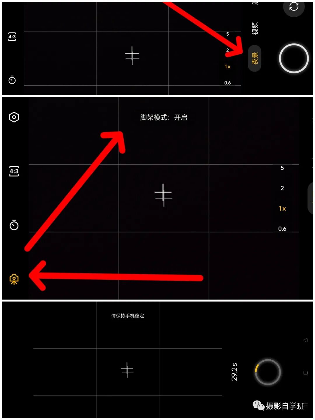 不同品牌的手机,不同型号的手机,设置方法不一样。以我目前在用的手机为例,像图8上方的图这样,我会选用夜景拍照模式。并且用三脚架稳定住相机,在夜景模式中,打开三脚架模式,像图8中间这张图一样。夜景模式,从参数上来讲,其实就是快门速度变慢了,曝光时间变长了,所以,手机要稳定,不能动,手机屏幕上也会有图8下方这样的提示。