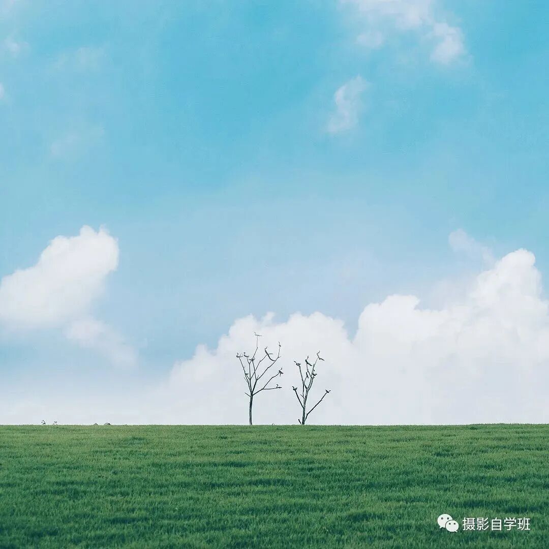 有些场景是适合拍摄简约的照片,但简约的时候,也要有重点,像图10这样,如果只拍摄草地和蓝天、白云,画面就会空洞,此时以两棵树为主体,居中构图,一张简约好看的照片,就被拍摄下来了。