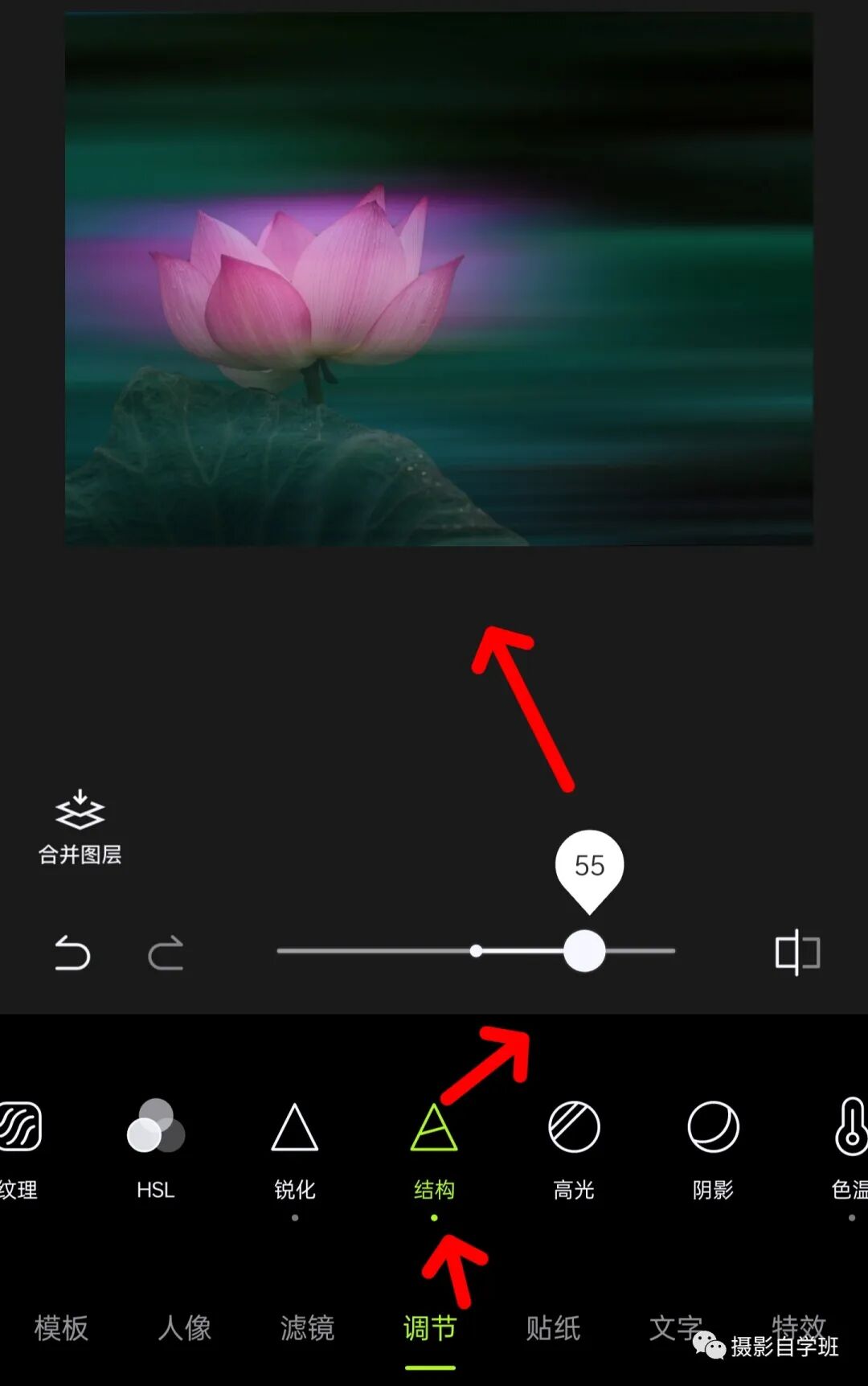如果你想让拖影的纹理以及荷花的纹理更清晰一些,可以选择图13,这样调节当中的结构,把结构这个参数适当增加就可以了,最后的效果图在图14。
