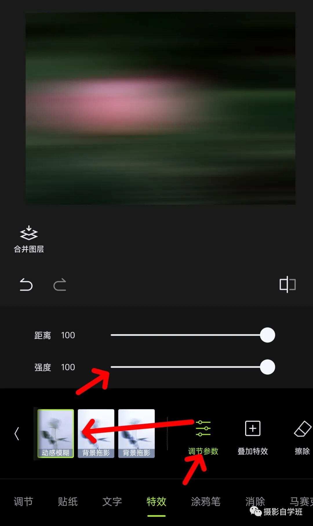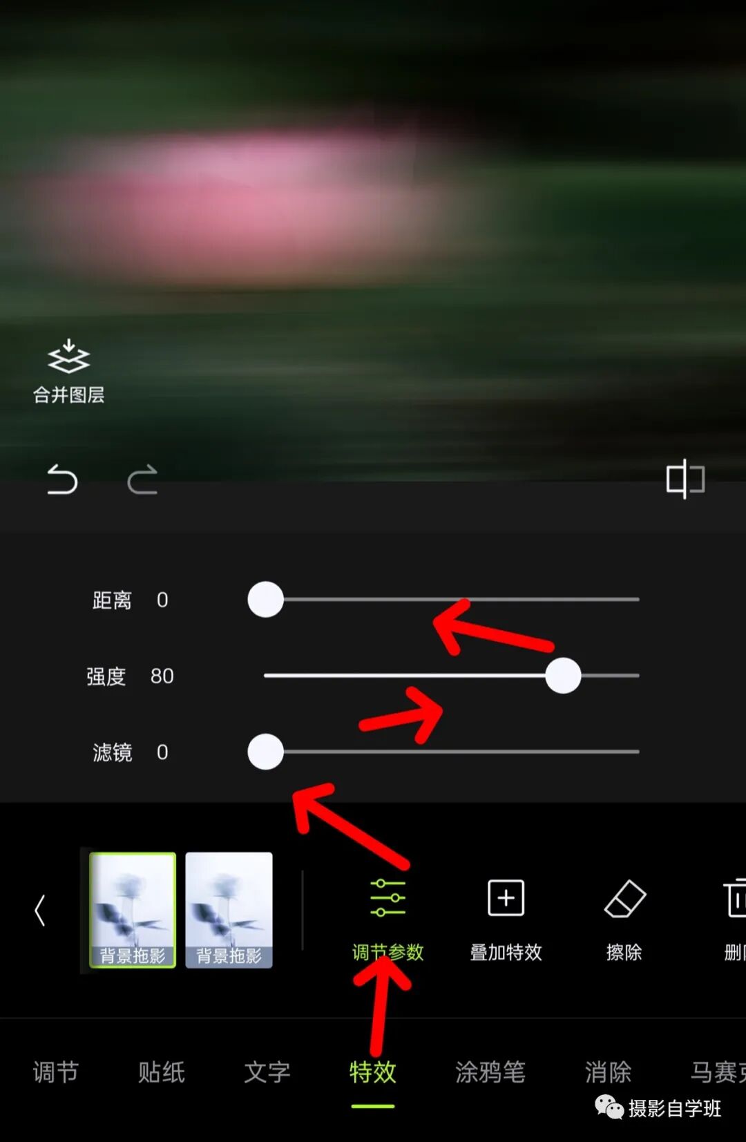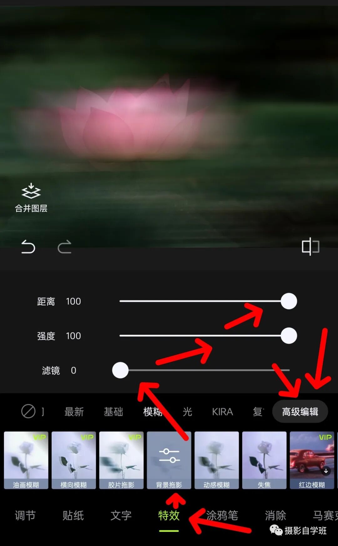 三、在众多模糊效果当中,下方出现很多小图,每一个小图对应的就是这个文字的模糊效果,选择其中的拖影效果,再点击小图上的两条横线,出现图4中箭头标注的3个参数,滤镜是调整照片颜色的,如果你想让你的照片是原图的颜色,那滤镜调为0,如果你喜欢它这个滤镜,就可以来回左右调节它,强度选择100,距离选择100之后,选择高级编辑。