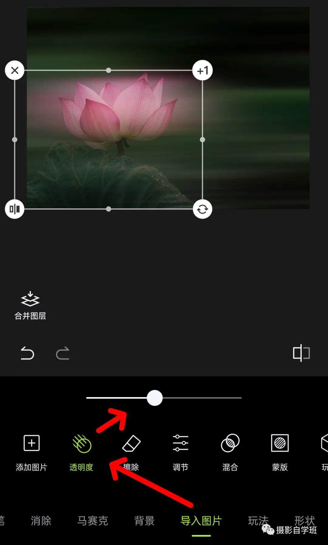 八、抠图之后的荷花以及荷叶照片,就导入到你的拖影效果当中了,手指按住照片可以上下左右移动,点击右下角的双向箭头,可以对导入的图片进行放大缩小,把后导入的抠出来的荷花,大小变成和原图的荷花大小一样移动,到原图荷花位置,再像图时这样点击透明度,把透明度调节到大约一半。