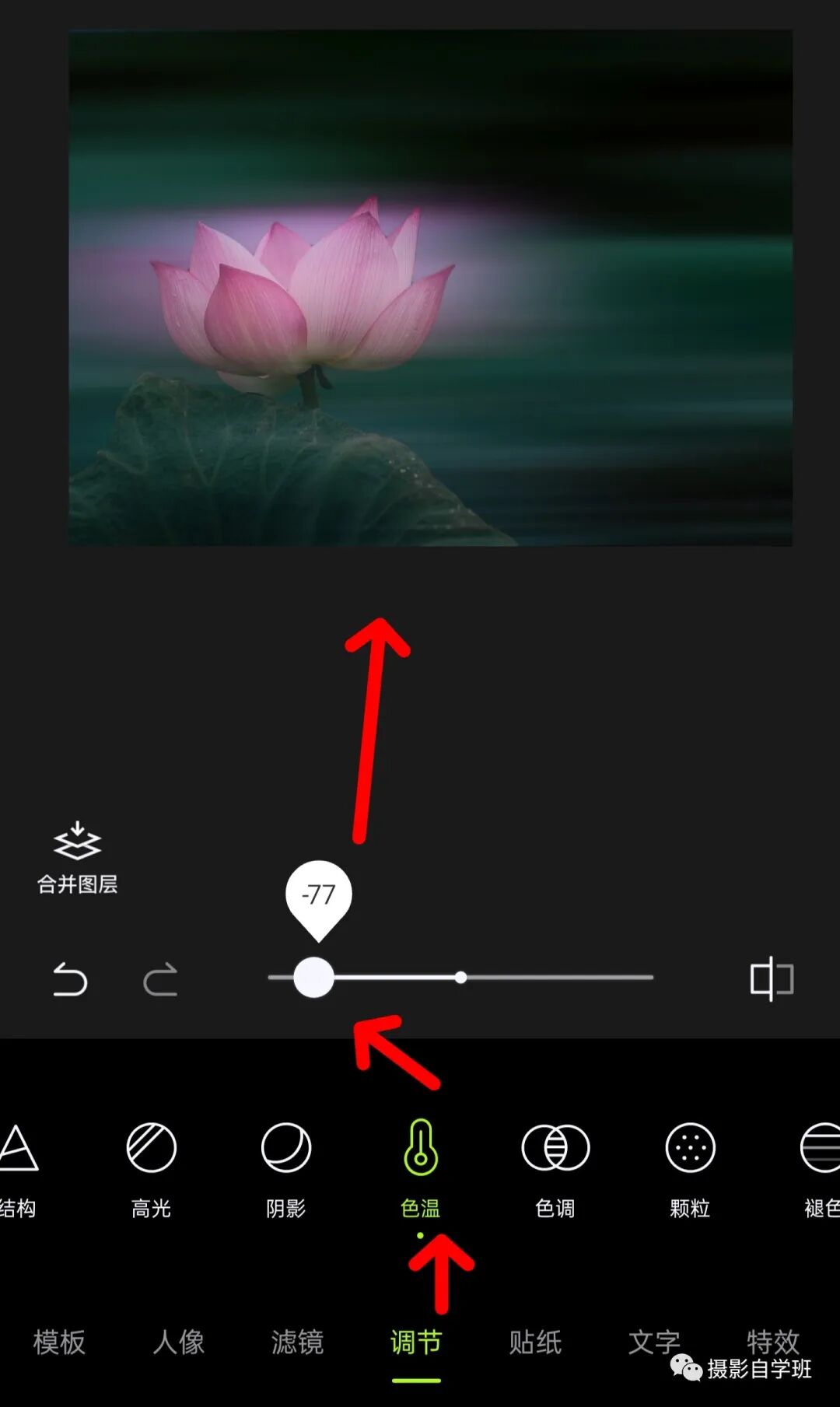 九、最后再进行调色以及精细调节,像图11这样选择调节,在调节当中选择色温,把色温的参数降到-77,这里的参数都不是固定的,需要根据你的图片自己观察着,看着来调节色温调到负数,代表照片会变得更蓝,显得更冷。
