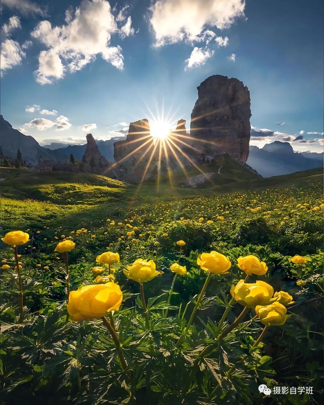 而遇到图3这样的场景,那就用花作为前景,来突出整个环境,单独只拍花,虽然有细节,但是画面还不够磅礴,不够广阔,而等待太阳出现在远处石头的缝隙处,调小光圈之后,就能把太阳拍成星芒光,让近处的花朵,作为前景,起到很好的点缀与衬托的作用,还能增加照片的层次,近景,远景都漂亮。