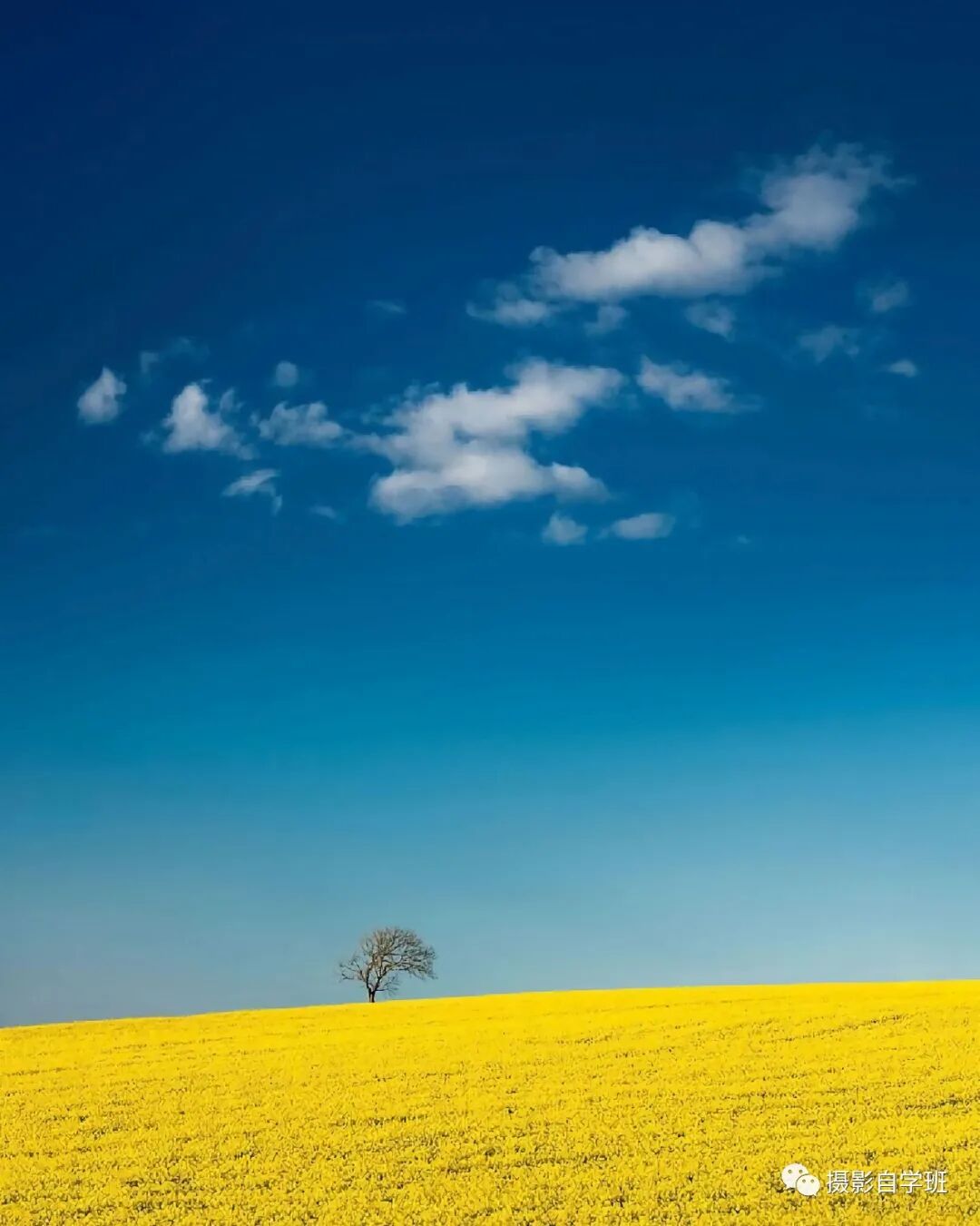 图7为照片增加了云彩,等待有云彩出现在画面当中,近处的黄花,与一棵树,在简约的同时,上方看起来不单调,不空洞,不要让简约变成简单,不要让画面当中,看不出来摄影师的安排。简单,就会让人觉得很一般,而摄影师用心等待,为简约场景增加的内容,会使得照片更加耐看。
