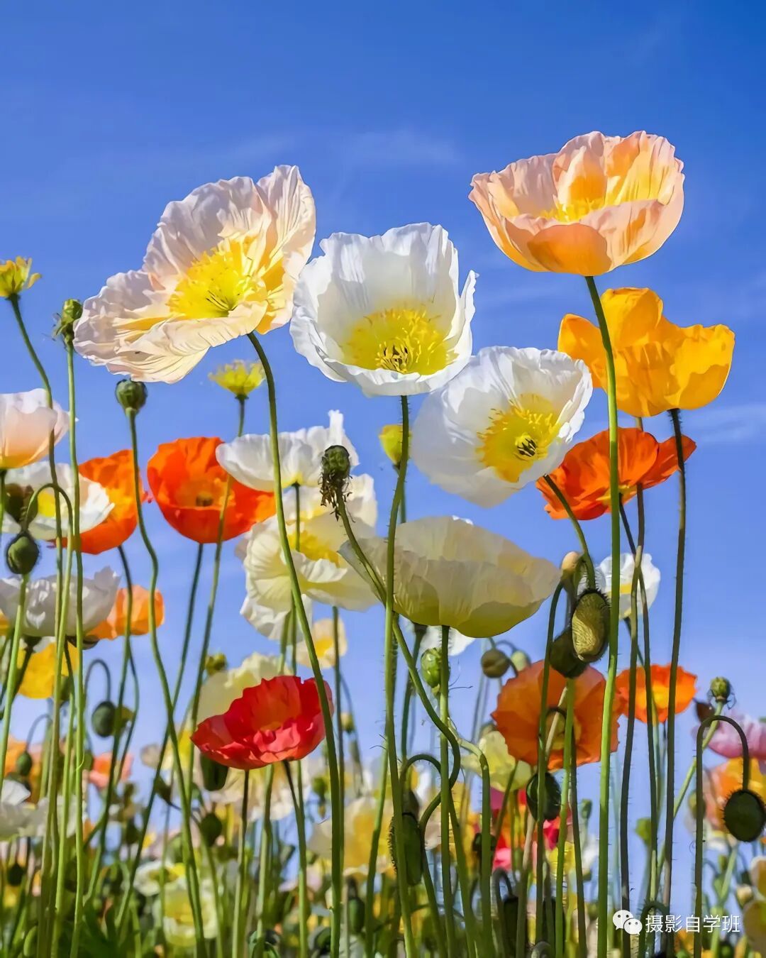 花朵怎么能拍成好看呢,遇到图2这样的花朵,远处没有太明显的景物,那就以这些花为主,拍摄的时候,不要站着从上往下俯拍,因为这个角度,和日常看花朵,没有任何区别,拍出来的照片,必然会普通一般,而应该像图2这样,把镜头挪到花朵的下方,从下向上仰拍的角度,即使是小花,也会被拍得非常伟岸。