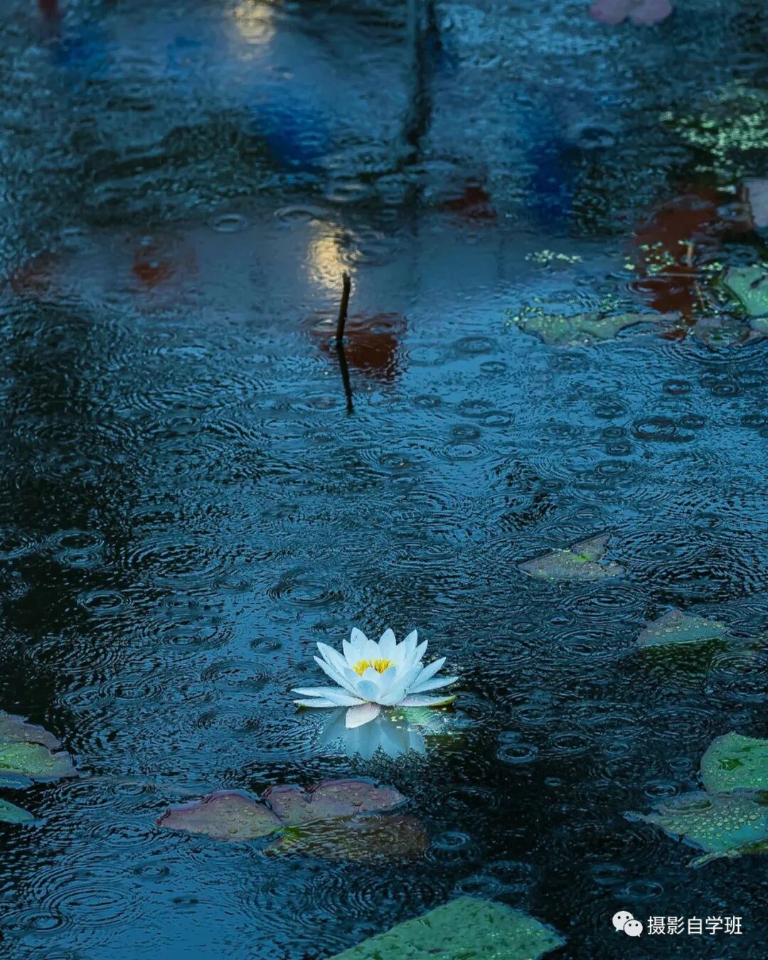 雨滴在水面泛起涟漪,远处有淡淡的灯火,增加温暖的元素,与环境的冷清形成对比,这样的拍摄会让你的荷花照片、莲花照片,与众不同。