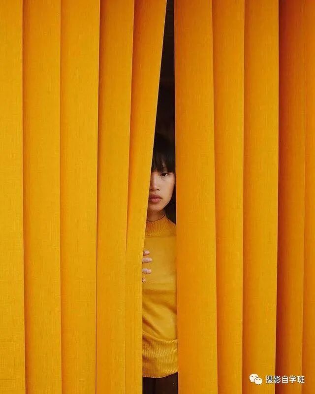 黄色布帘,人穿黄色衣服,中间阴影暗色缝隙,