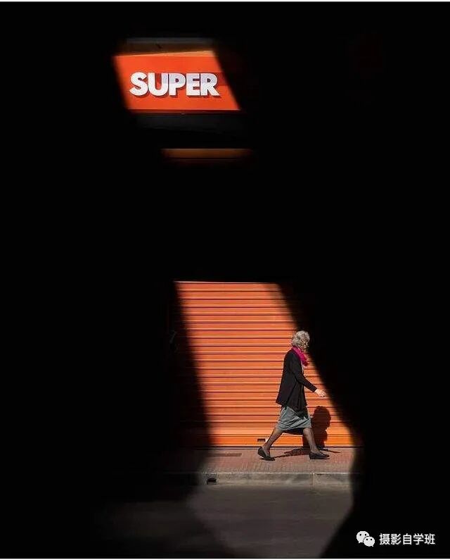 在街上,看到一处光影,没有其他色彩,等待行人经过。