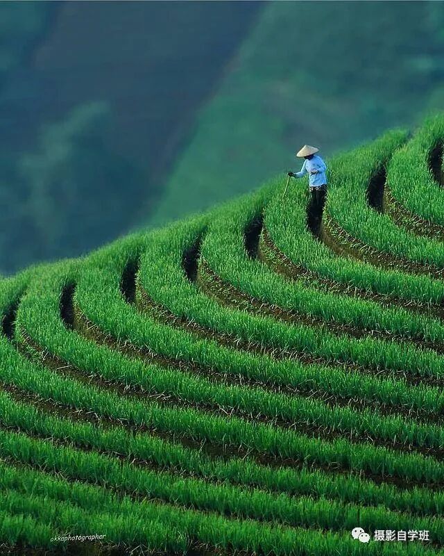 绿色的梯田,线构成面,与蓝色衣服的人,