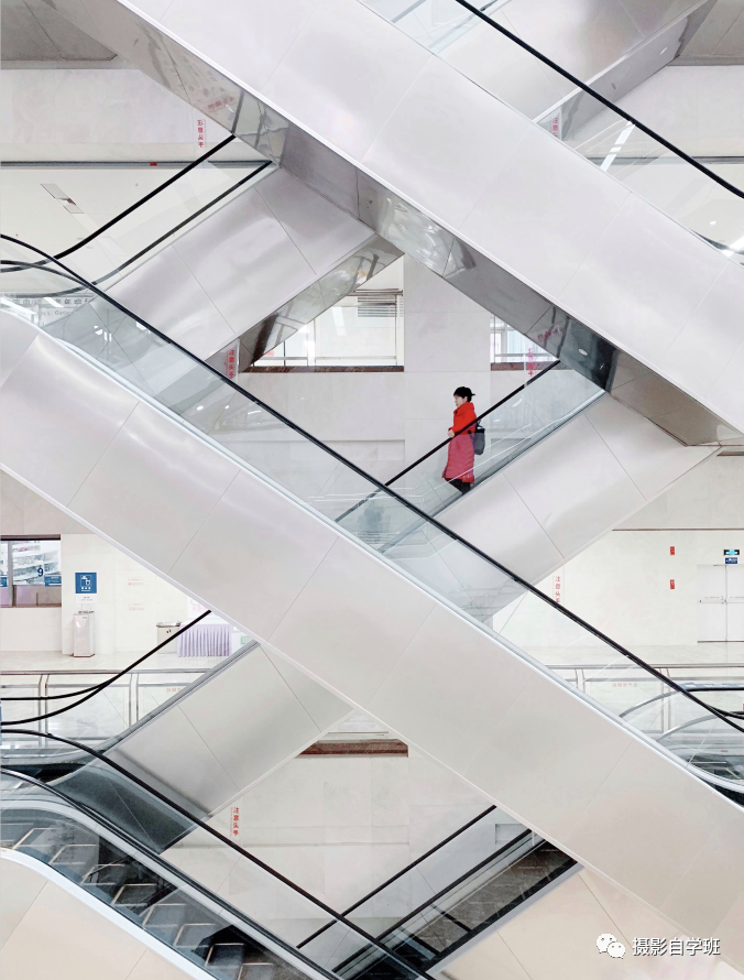 如果只拍摄电梯,那没啥意思,但等待画面中,没有其他人,只有一个穿着鲜艳颜色衣服的人出现是,照片就灵动了起来。