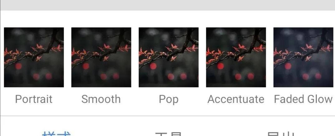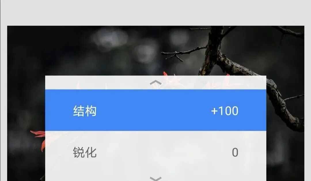 (3)然后再点击工具选择,突出细节,手指上下滑动选择结构,向右滑动,增加结构,让照片上红色叶片以及枝干,看起来纹理更好。但是,背景也因此而清晰了,背景清晰,让这张照片看起来更乱,所以: