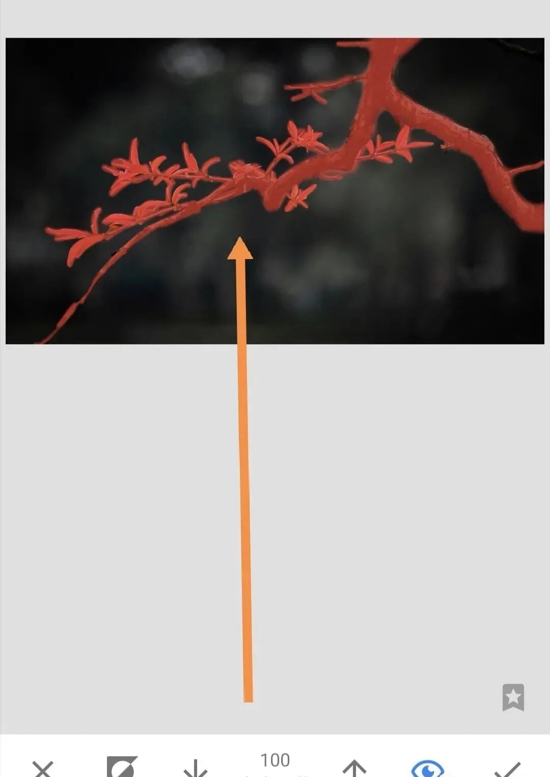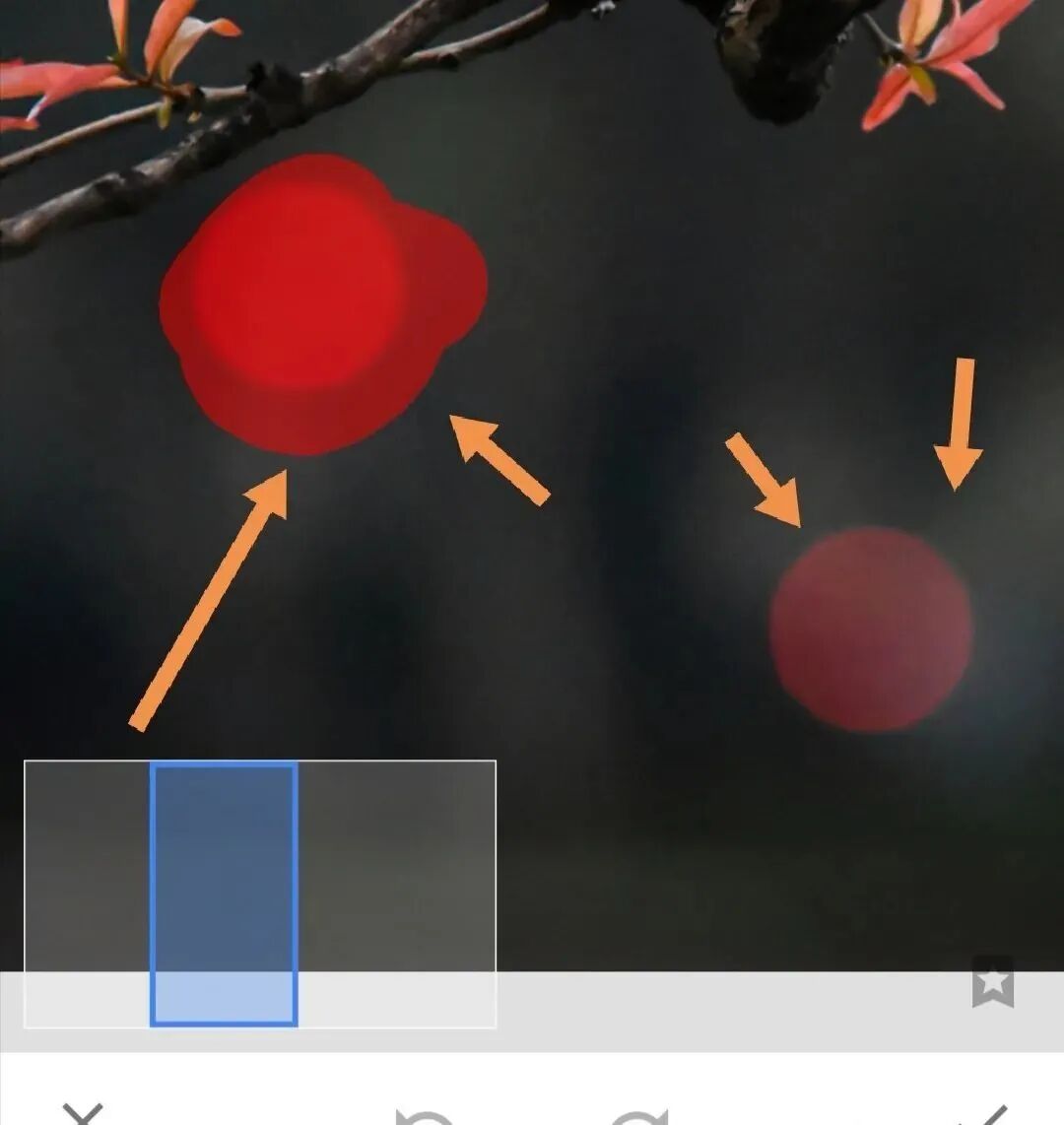 (5)在蒙版中,把页面下方突出细节,数值调整为100,对树干以及叶片进行涂抹,让他们更清晰,让背景恢复成原样。调整好之后保存,再回到工具中。