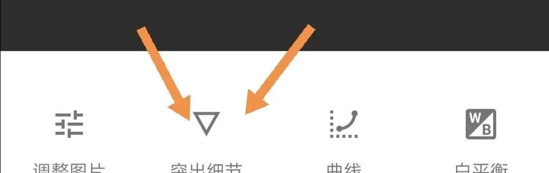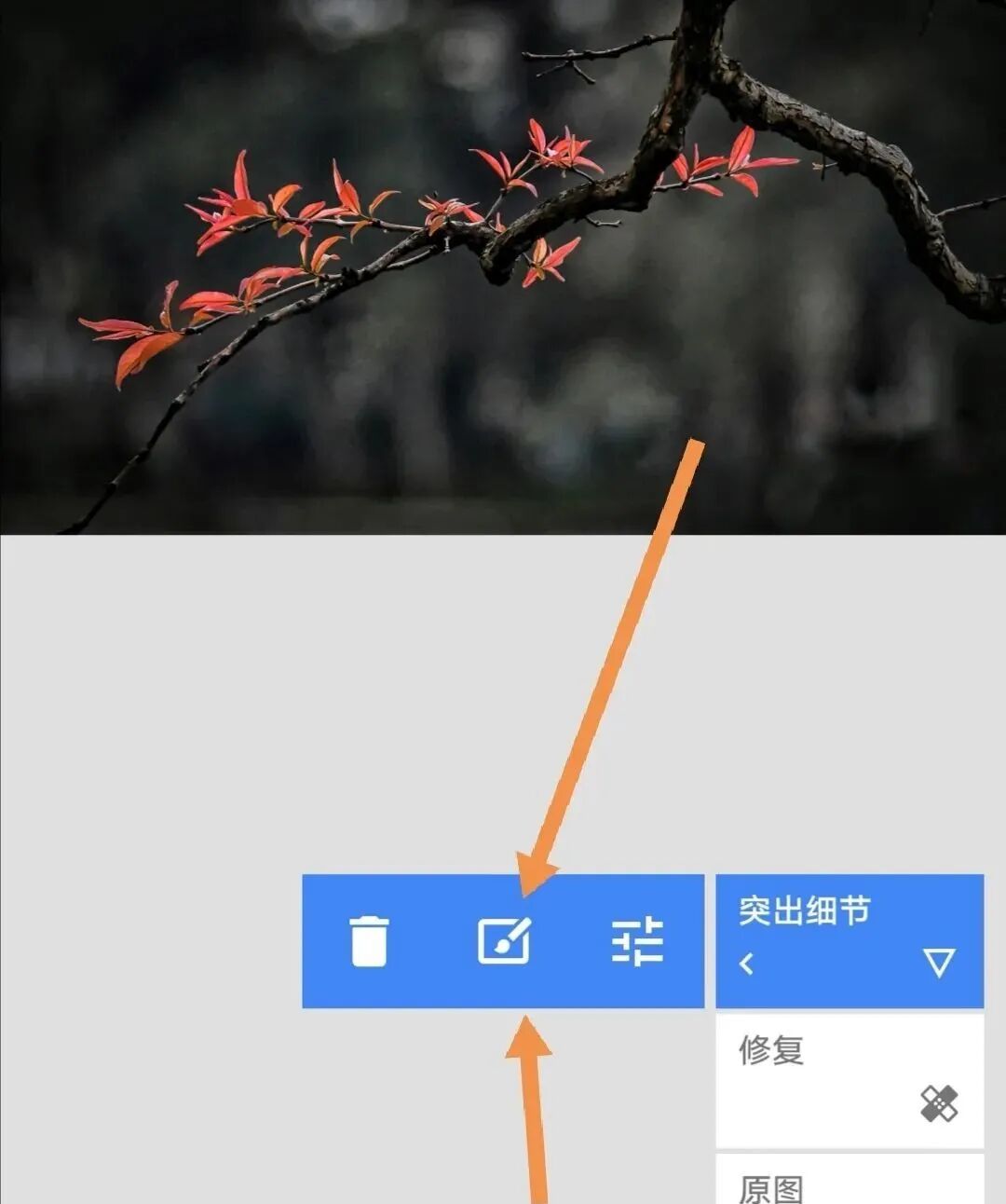 (4)点击右上角弯曲的箭头,查看修改内容,右侧出现突出细节,点击它,出现三个选项,点击中间的画笔,进入突出细节这一步骤的蒙版。