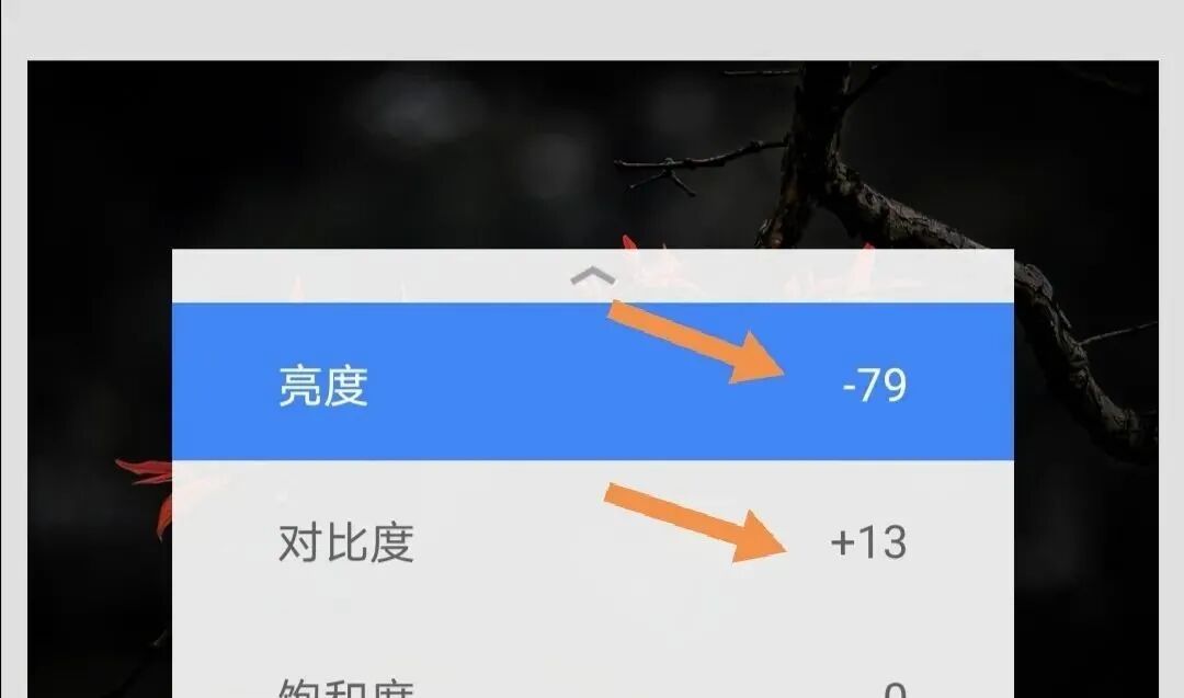 (6)点击调整图片,选择亮度,降低照片亮度,选择对比度,提高照片对比度,让背景看起来更黑。但是通过这么调节,红色的叶片也变得很暗了,所以: