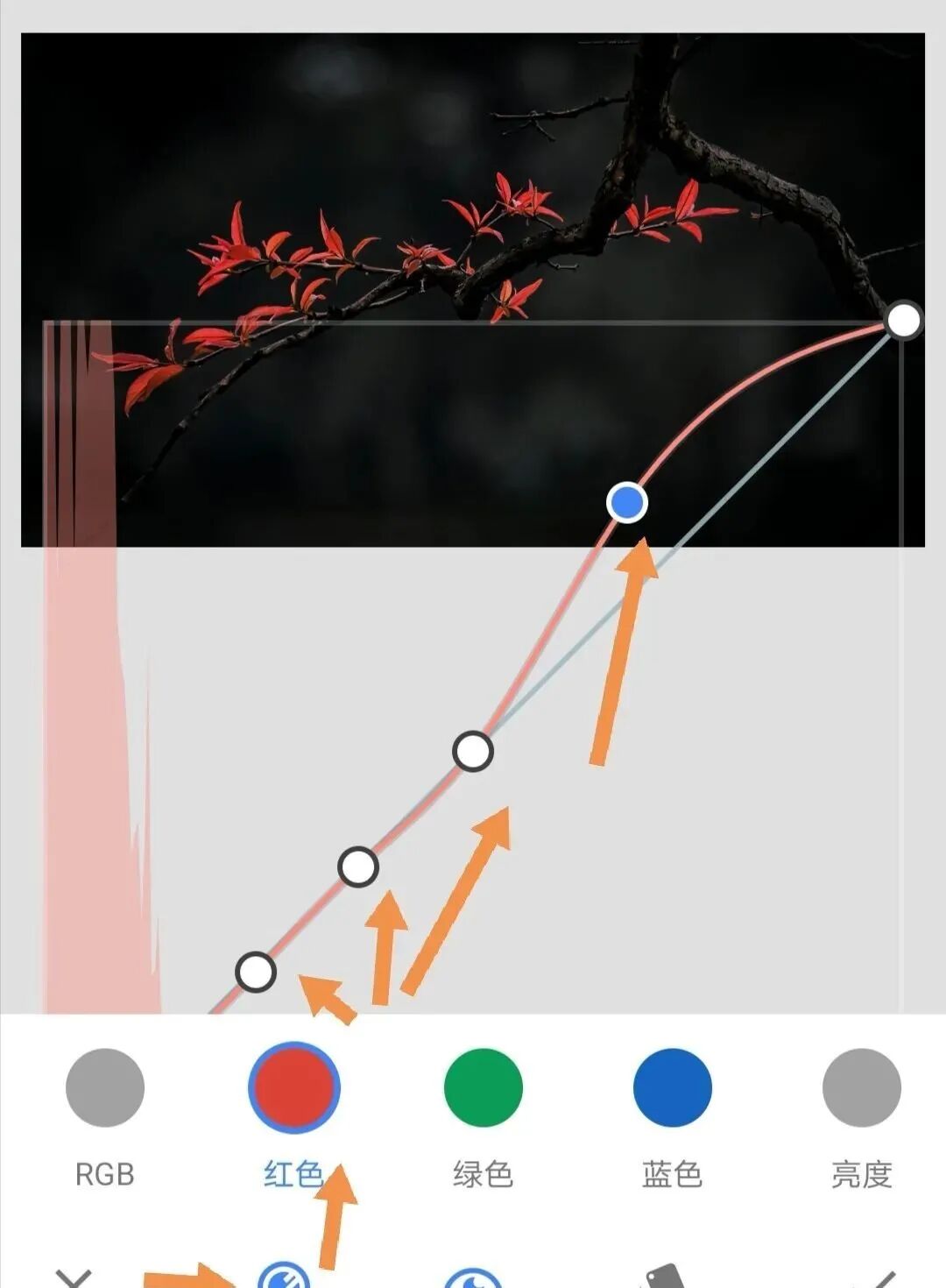 (7)选择曲线,在曲线中选择红色曲线,在红色曲线的右下方选三个固定点。因为右下方主要是调红色暗部的,红色曲线的右上方是调红色亮部的,因为照片中的红叶,比较亮,所以我们对红色亮布进行调节。在红色曲线亮不选择一个点向左上角拽,红色看起来就更亮了。