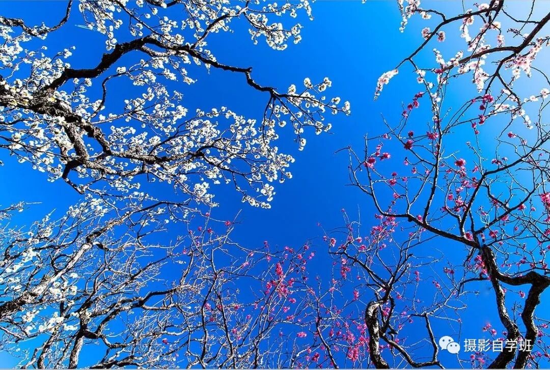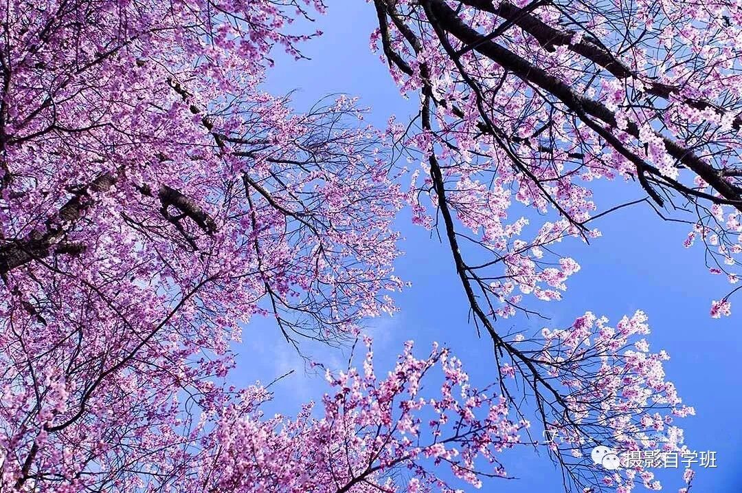 找到一个合适的位置,抬头向上仰拍,如果树高还好,如果树不是那么高,还需要蹲下一点,这样可以让你仰拍的角度更好。仰拍的重点是,花树上的枝条,要有相同的指向性,比如上面这张照片,有的枝条,指向中间,有的枝条指向边缘,照片的美感相对来说,就会差一点,而下面这张照片,所有的枝条几乎全都指向中间,指向目的地相同,照片看起来就会更有方向感,这样仰拍的花树,照片才会更好看。