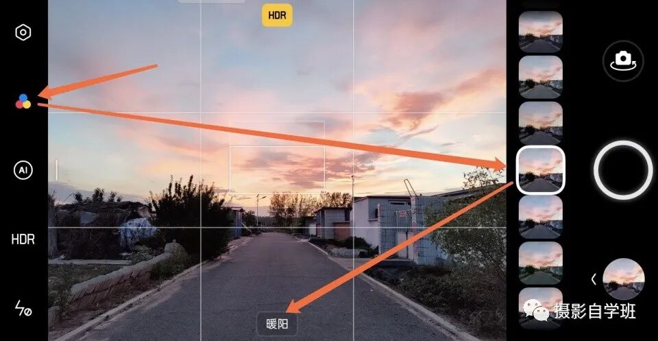 要学会使用你手机中的滤镜,它们可以帮你照片的颜色更漂亮。打开手机相机之后,有3个圈的图标,就是滤镜。当你拍摄晚霞的时候,可以分别使用,观察看哪一个更好看,使用它就行了。滤镜是手机系统只自带的,帮你调好的一些色彩参数,用起来方便省事。