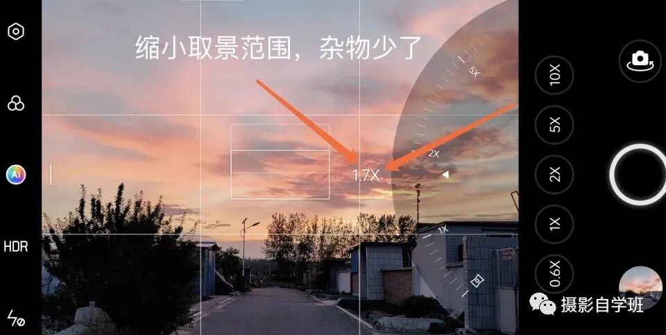 我当时这个拍摄环境中,树以外,杂物比较多,此时我们就可以调节手机焦距,来缩小拍摄范围,从而减少杂物。