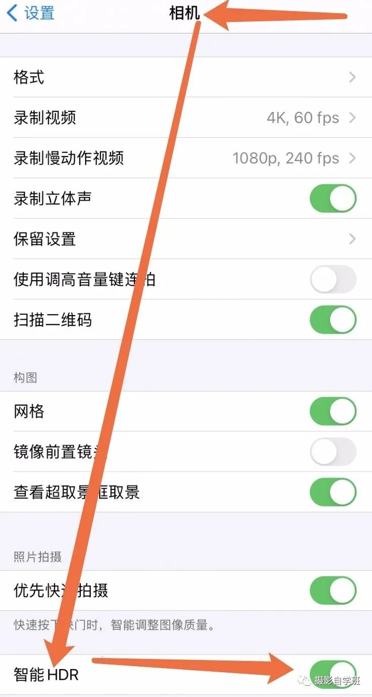 现在HDR,苹果手机也有,拍摄之前,找到设置,然后找到相机设置,再找到HDR,打开它。当照片中,光比较大的时候(解释,光比,就是亮部暗部对比明显),HDR可以照片暗部亮部的细节更好,下面解释原理。