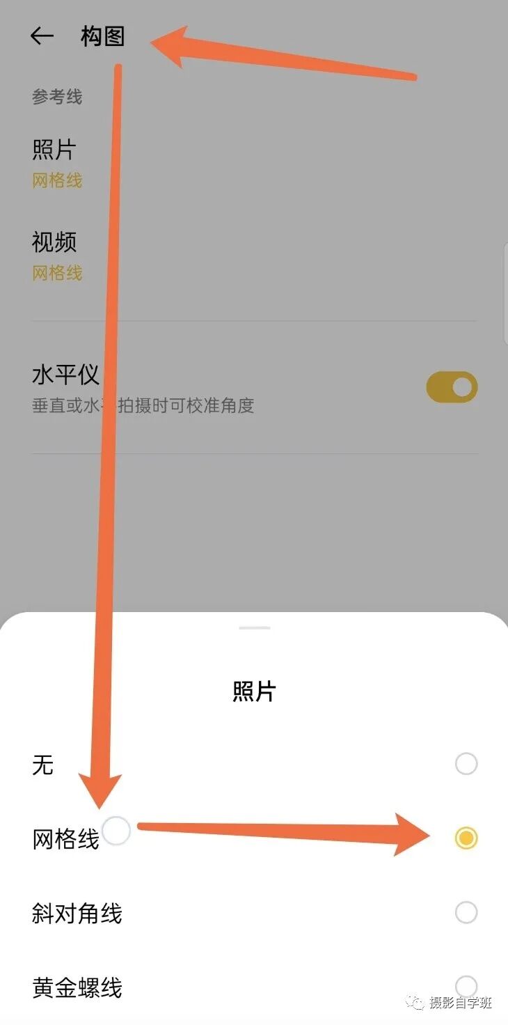 首先打开你的手机,拍摄之前找到手机相机中的设置,在设置当中,苹果显示的是网格线,有些安卓手机显示的是构图线,有的也是显示的网格线。把“井”字这个线,调节出来。这样,当我们拍摄的时候,能够让我们的景物,保证横平竖直。