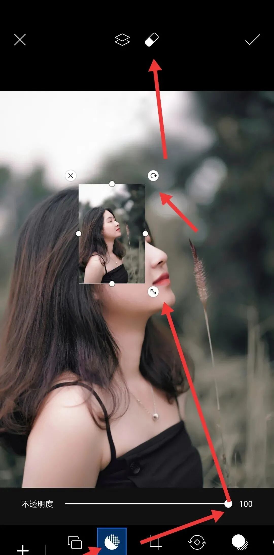 (3)按住照片,移动到左上角,按住右下角双向箭头,拽动箭头,可以调整后添加照片的大小,调大后添加的照片,让人的脸,位于底图右上角处。