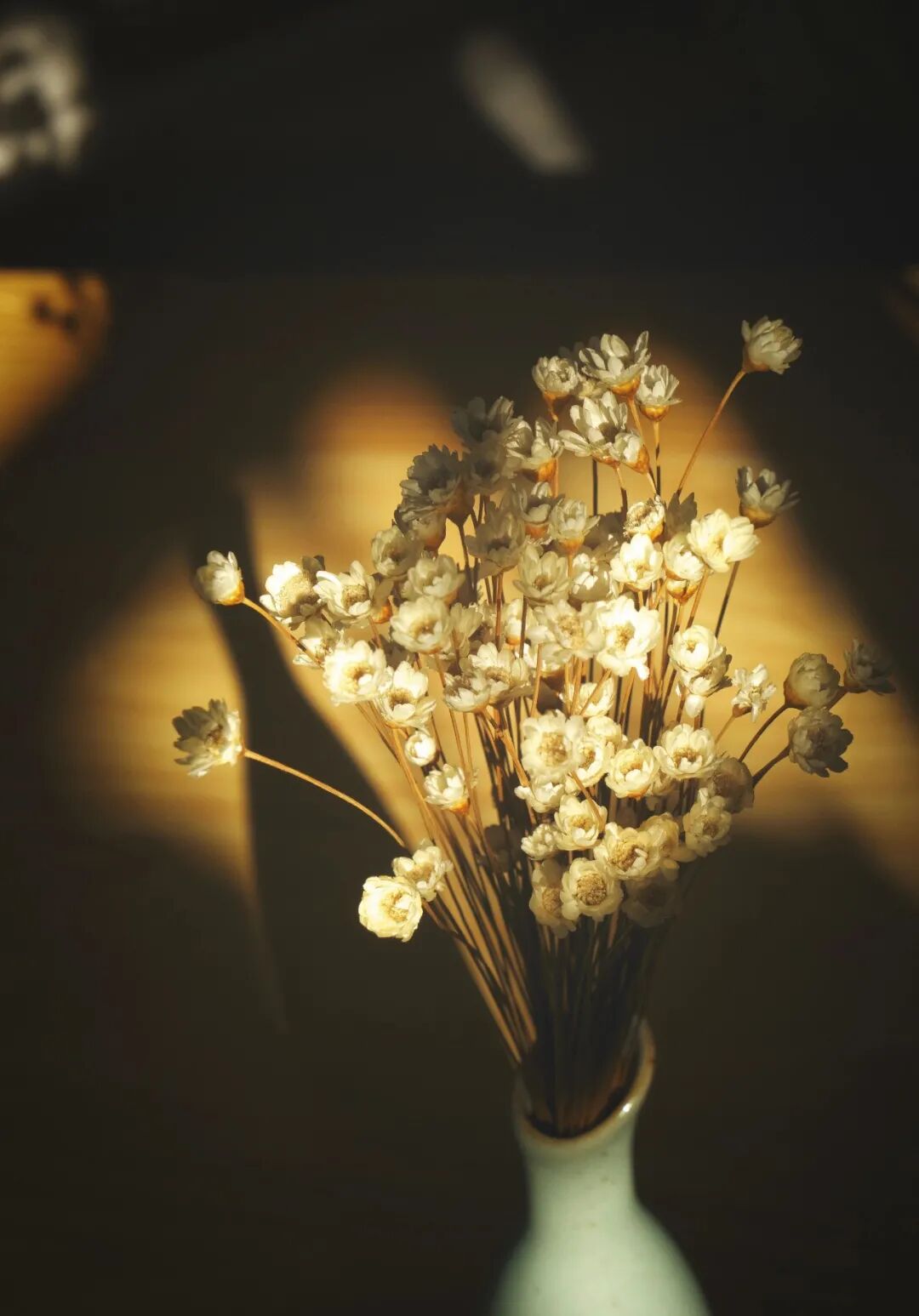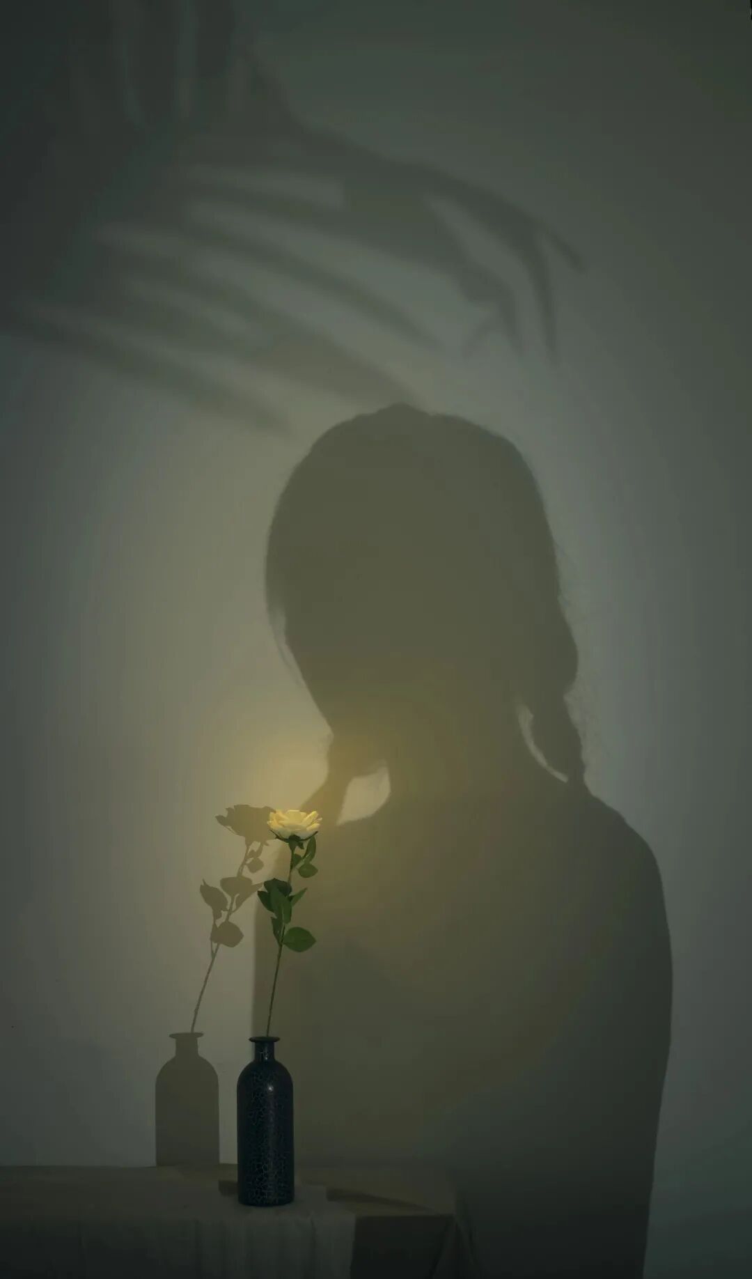 (3)找一面干净的墙,放一枝花,光源点照在花上,人和植物的叶子,在光源前,人和植物遮挡光线形成的影子落在墙上,与光源点处的花朵,形成很好的明暗对比,让一个平面的墙,也能有这么丰富的画面。