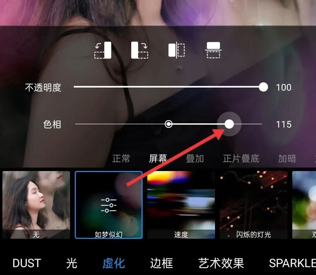 (6)再点击页面下方遮罩,选择“虚化”,在“光”或者“虚化”中,找到你喜欢的效果,我以虚化中的“如梦似幻”效果为例。点击小图,还可以调节色相,改变光的颜色。