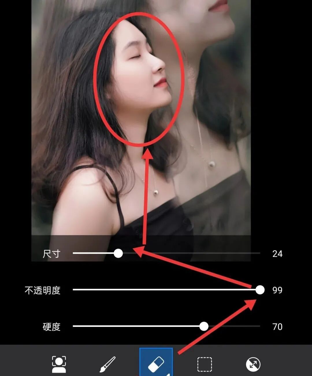 (5)在蒙版中,点击页面下方的橡皮,调整橡皮参数如图,对底图人物面部进行擦除,让底图人物面部,可以更清晰地展现出来。到这一步位置,可以实现人物虚化的双重曝光效果。