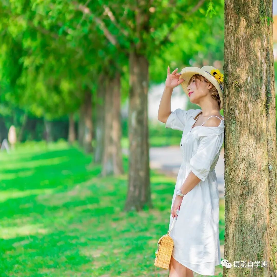 树要出现在人物的背部,在人面部眼神的前方,进行留白,可以让照片看起来,更加舒适、宽松、自然。摆姿势,并不是不可以,但姿势不要过于扭捏,过于做作,像上面这张照片,把手放到帽子上,另外一只手拎着包,抬起头,看向天空就很不错。