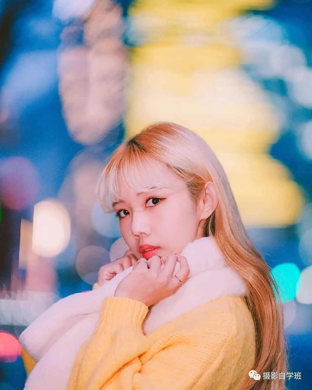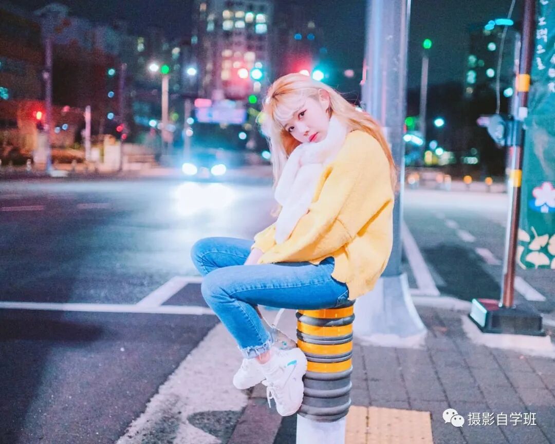 人穿的衣服,黄色的很显眼,背景当中也有光斑,这样的照片,错在哪了呢?错在取景范围太大,导致背景过乱,尤其人物的背部,后方有一个粗壮的,直直的电线杆子,很影响照片整体的美观,如果拍摄夜景照片,想让画面更加干净、纯粹,应该怎么拍呢?看下面的例图。