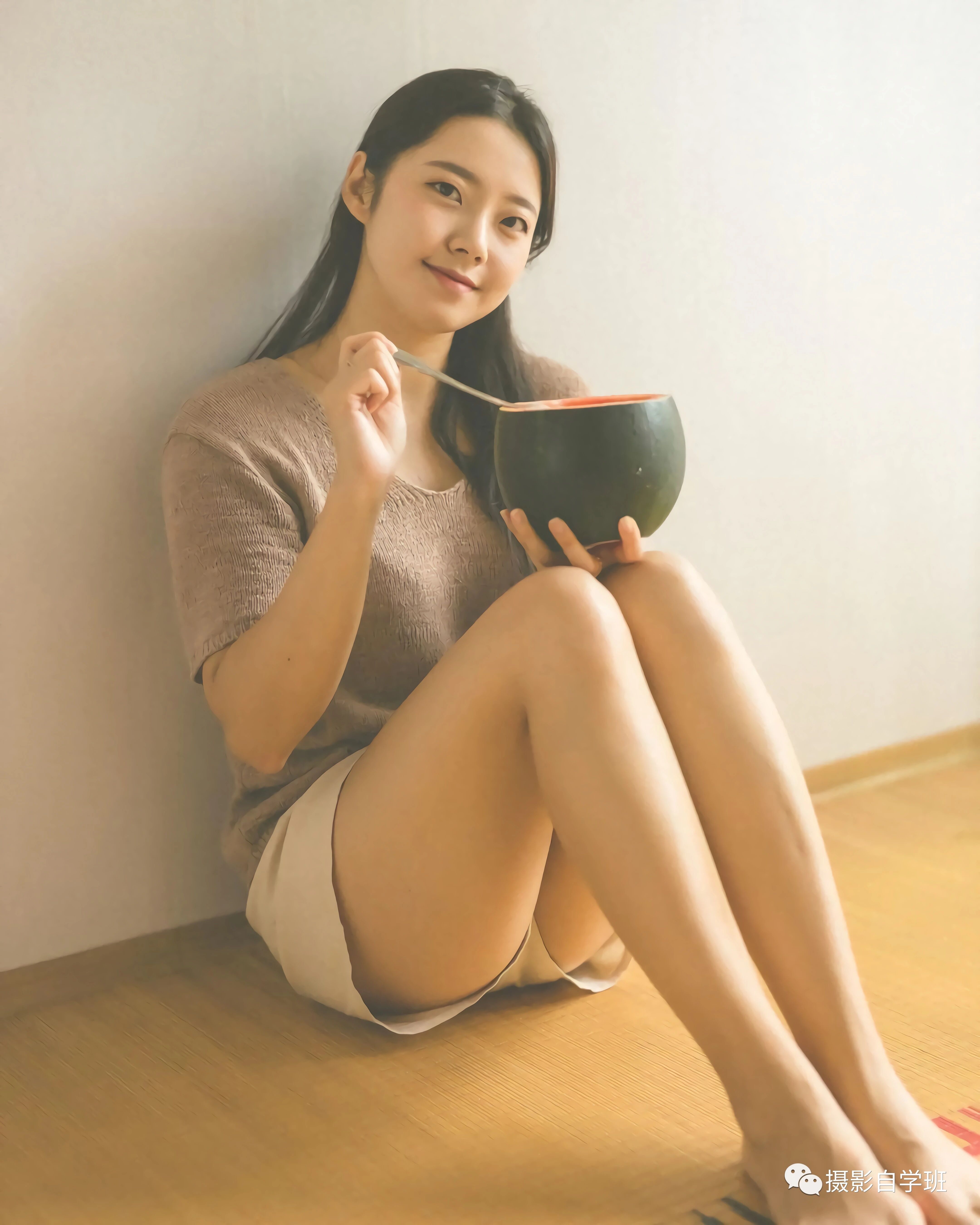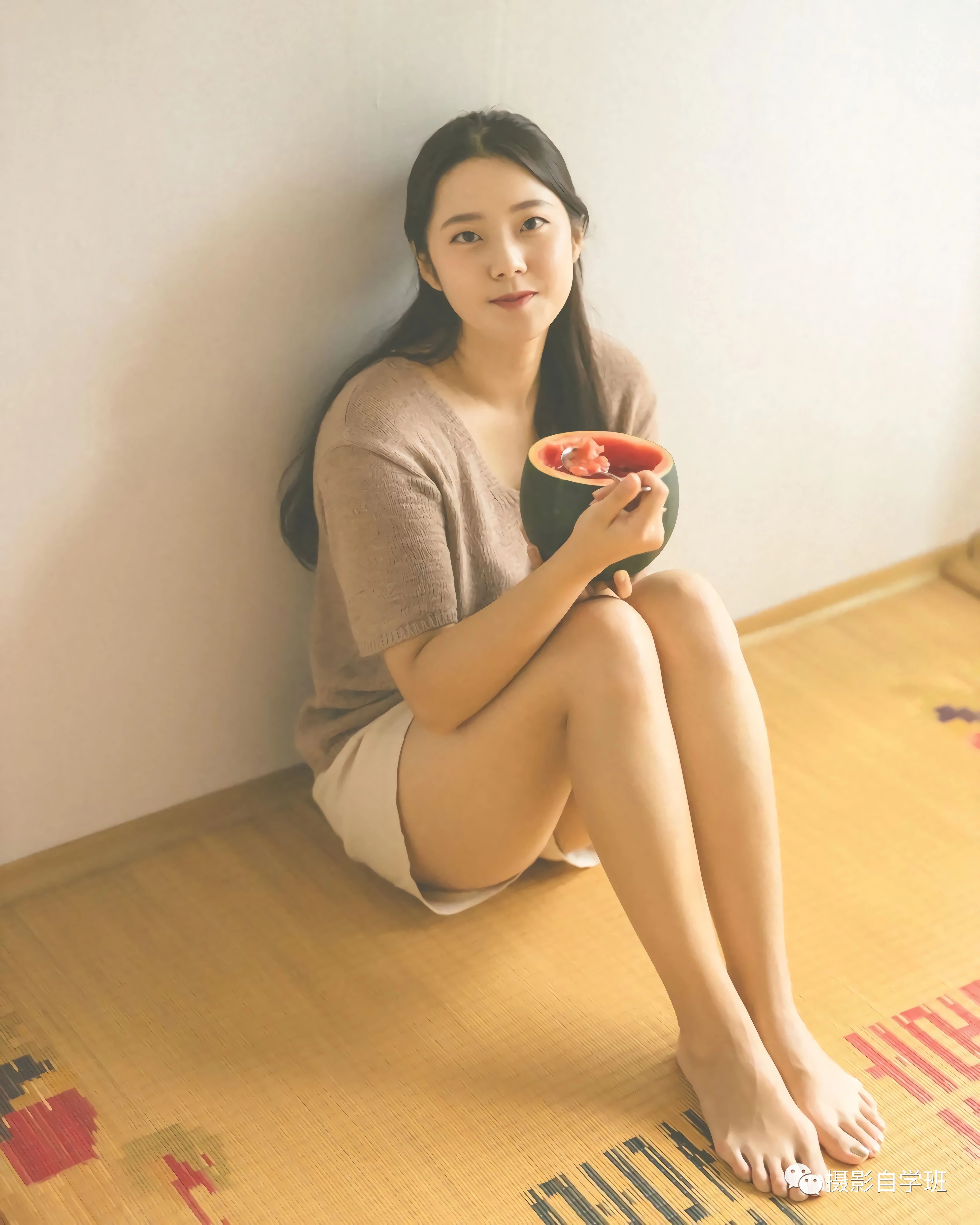 冬天有雪,夏天有西瓜,我们也可以在夏天拍摄的时候,手捧着西瓜坐在墙边,眼神看向相机。