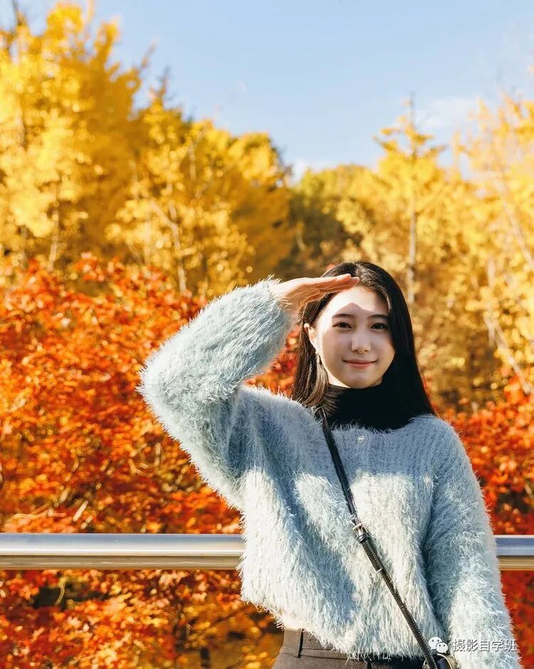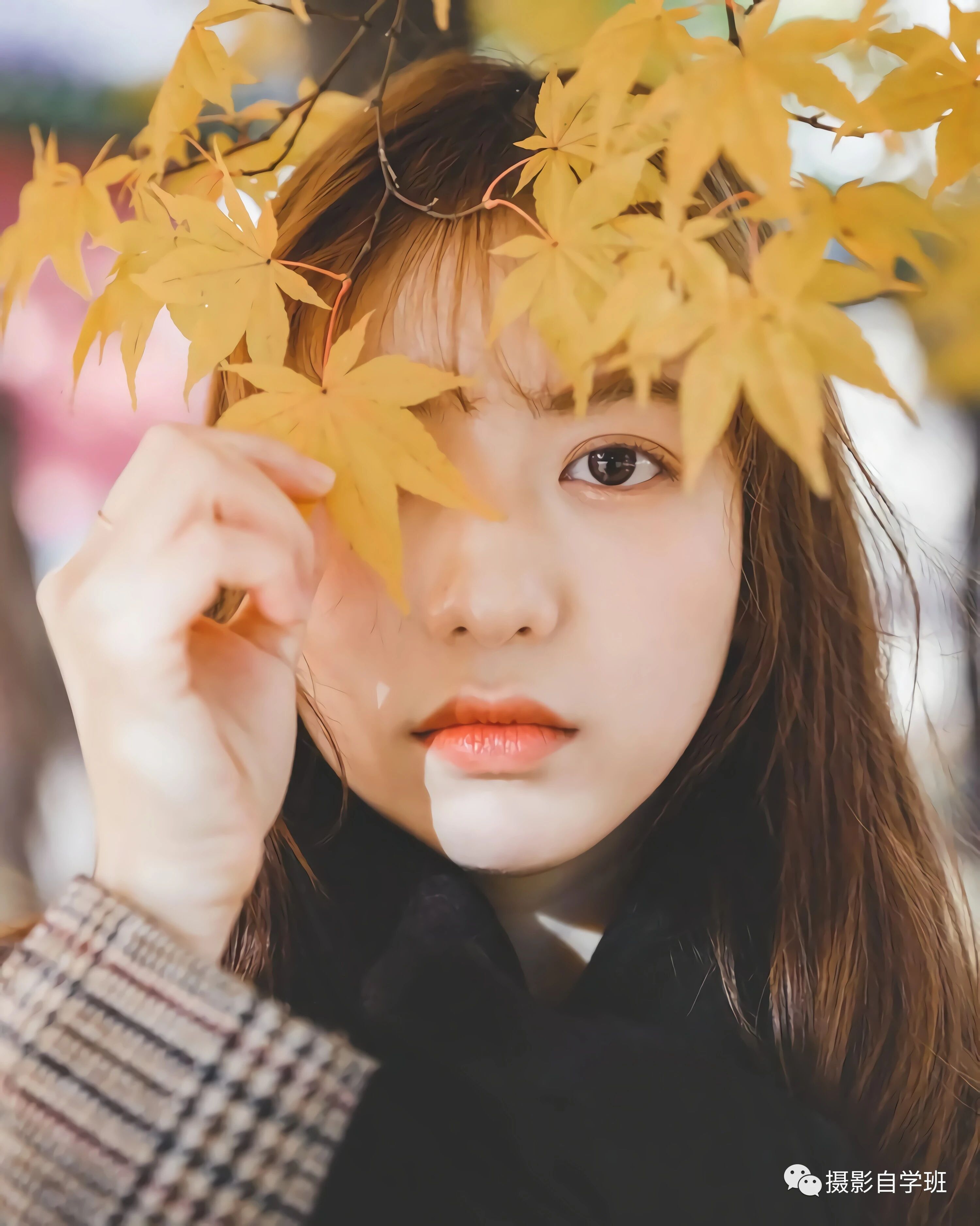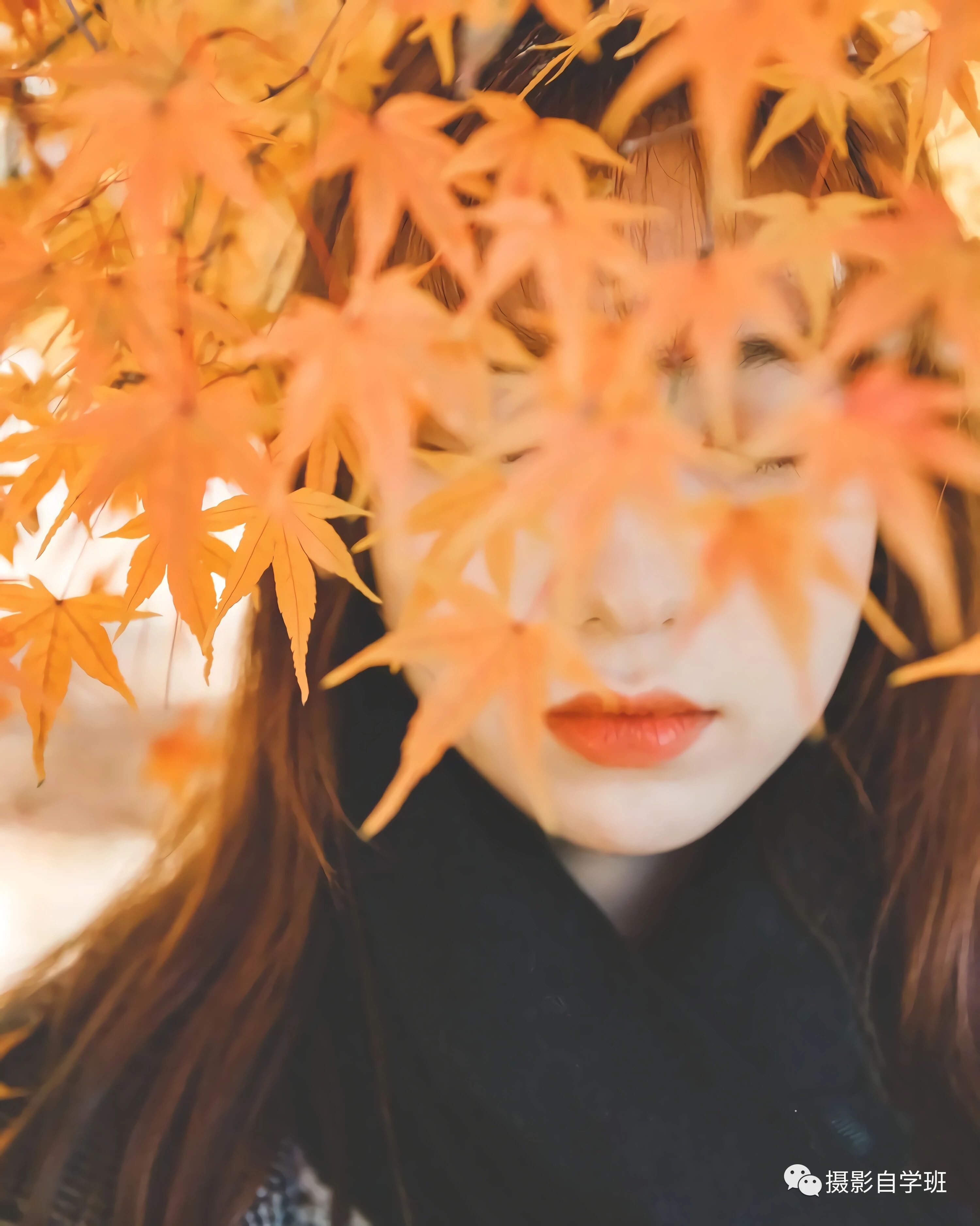 枫叶这种漂亮的树叶,在生活当中很常见,拍摄人像的时候,可以让人隐藏在树叶当中,但切记不要像上图这样,让枫叶把整个人的脸都挡住。因为你要拍摄的是人,虽然上图比较含蓄,但是对脸造成了很大影响。我们可以像下图这样,让人一只手捏住一个树叶,挡住一个眼睛,另一个眼睛露出来,拍摄人像的时候,人露出眼睛,才更能体现重点,手和树叶结合出来的动作,可以让照片看起来更好看。