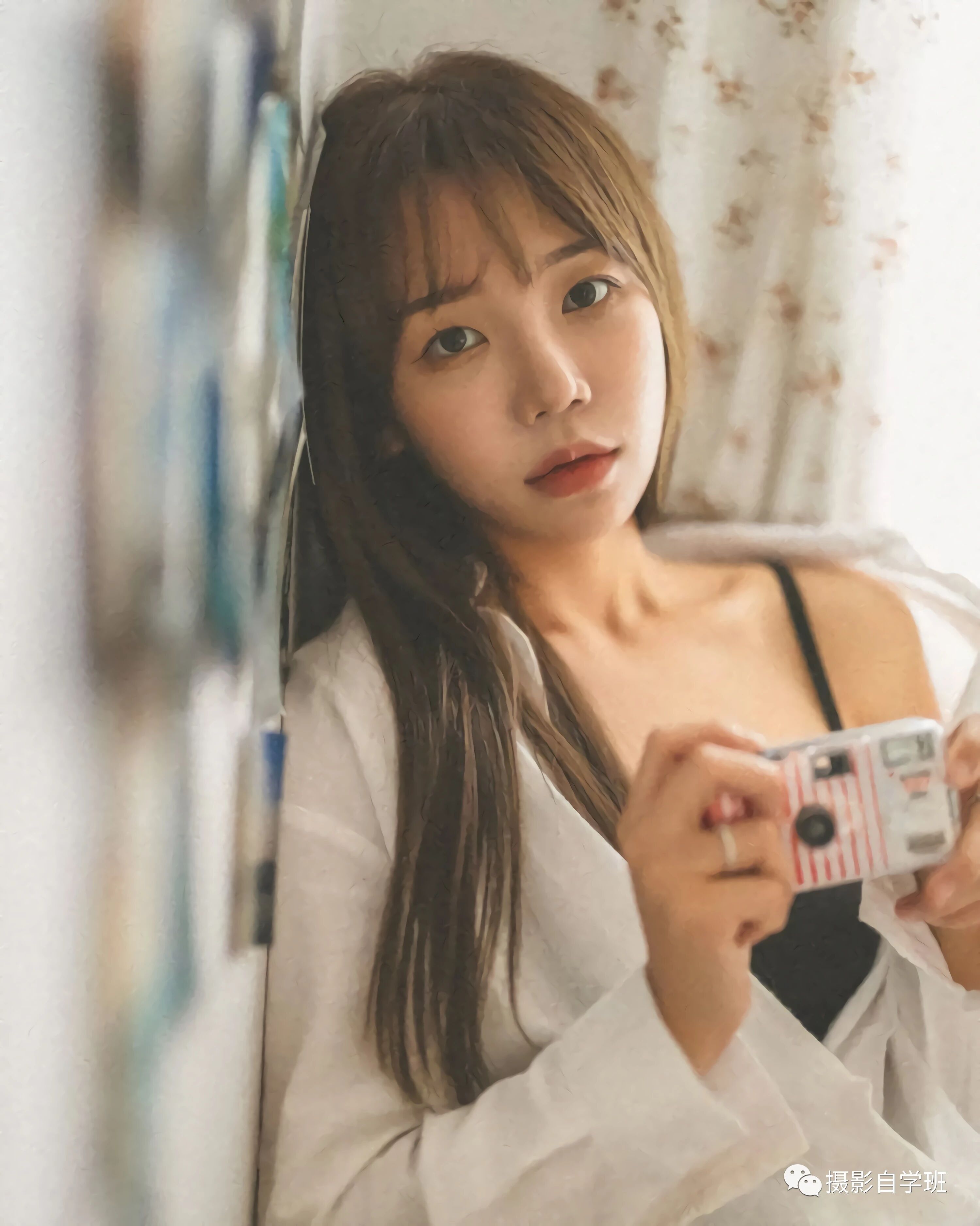在家拍摄时,我们可以穿着放松一些,手中拿着相机,摆弄相机,但眼神看向镜头,可以像上图这样,脑袋靠在墙上,同时拍摄者也把摄影设备放在墙上,顺着墙面对焦在人物的眼睛上,也可以像下图这样,让人坐在窗前,窗口光可以为人的面部进行补光,手中拿着手机,手有处安放,就不会太尴尬。我们拍摄时,可以像上下这两张图一样,都看一下镜头。也可以不看镜头,看着窗外更体现出故事感。