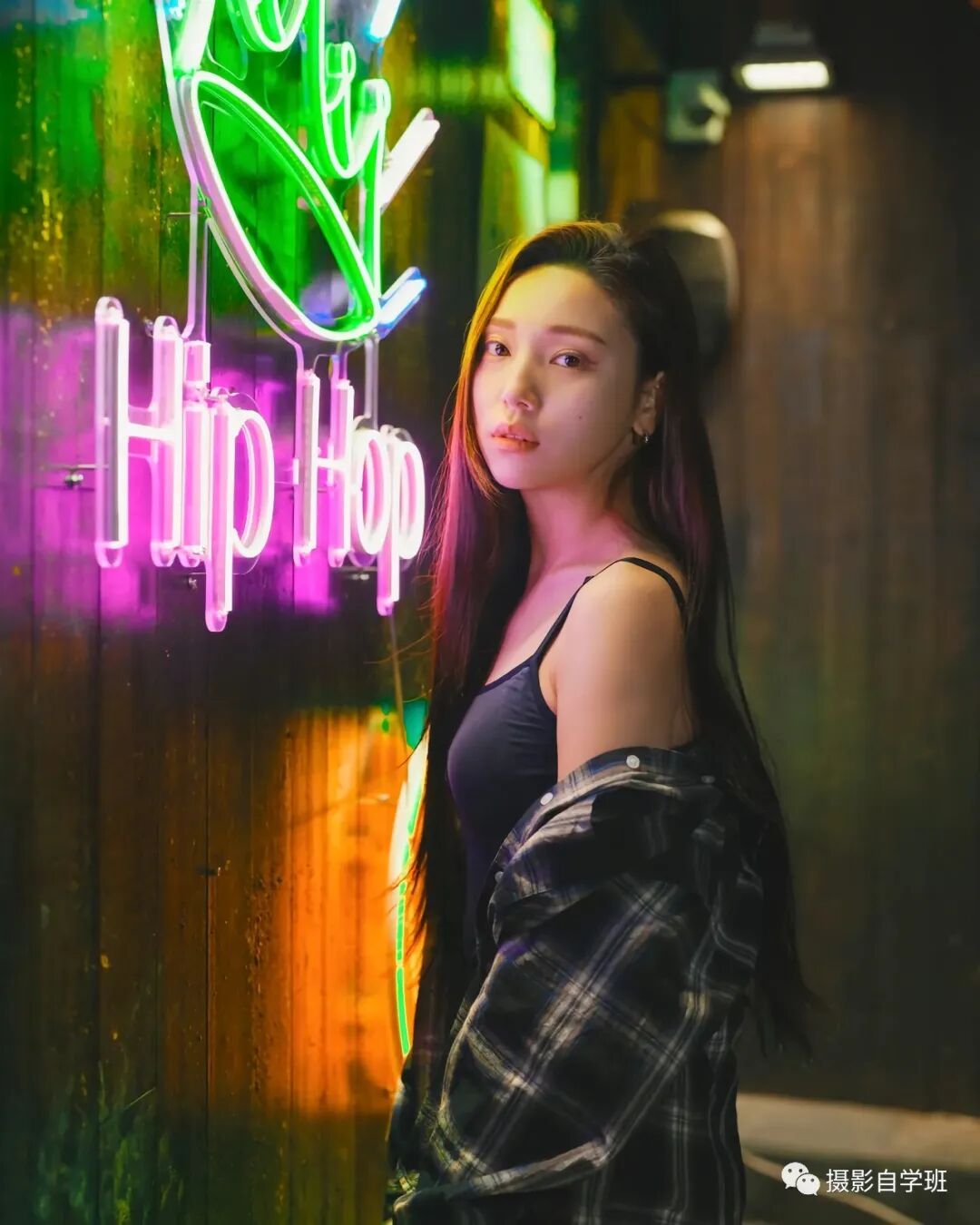 夜晚拍照如果环境比较暗,一定要带上补光灯,这样才能像上图一样,把人的脸部拍亮。如果遇到栏杆,让被拍摄的人,直接靠在栏杆上,就可以了,使用大光圈镜头,对焦在人物的面部,背景的光,就能够被拍成漂亮的光斑了。如果没有补光灯,那我们就要注意寻找环境光,来为面部补光,像下图这样,让被拍摄的人脸,冲着光源,墙上的光,就能给人的面部补光了,侧身拍照,这种姿势也很自然美观。