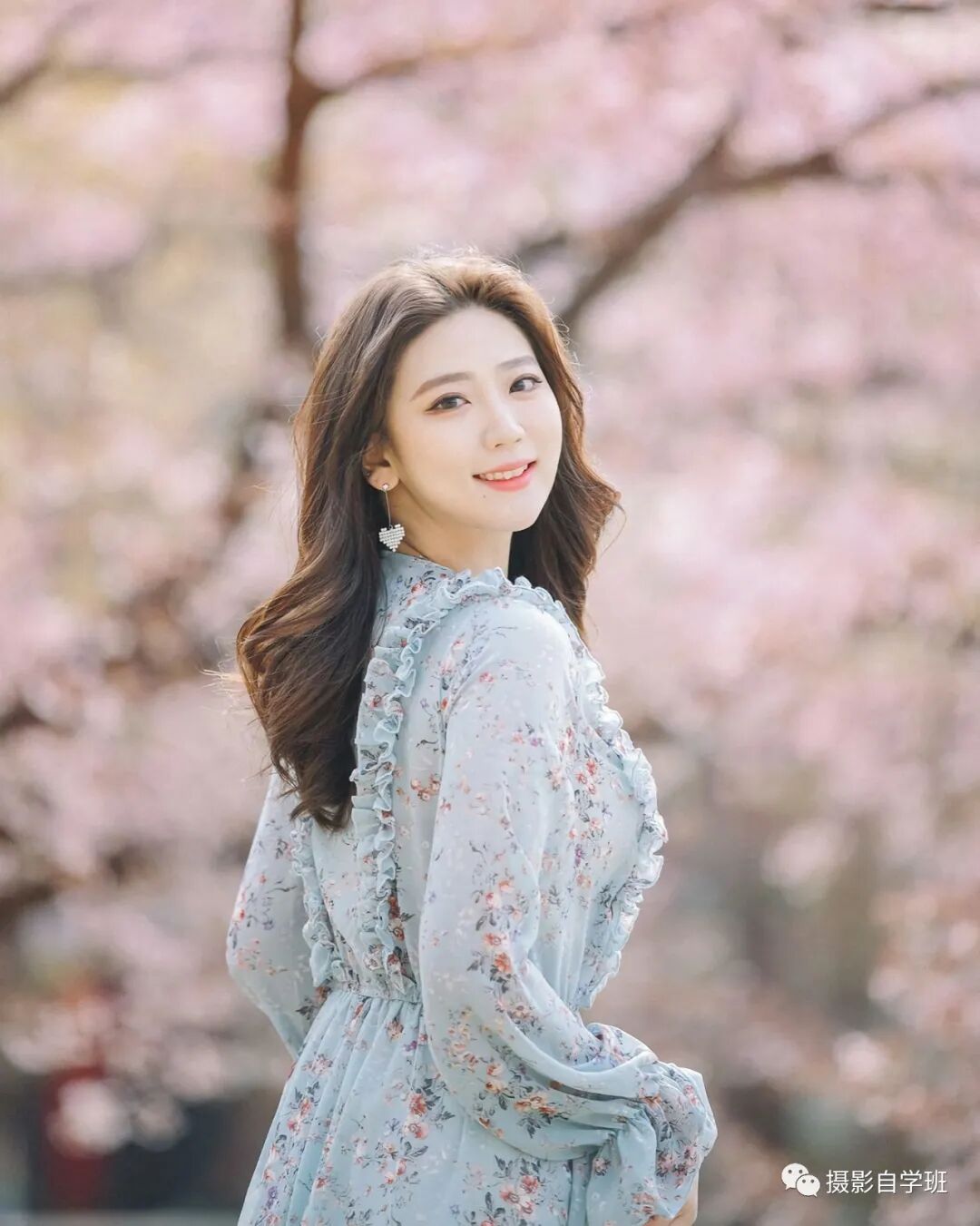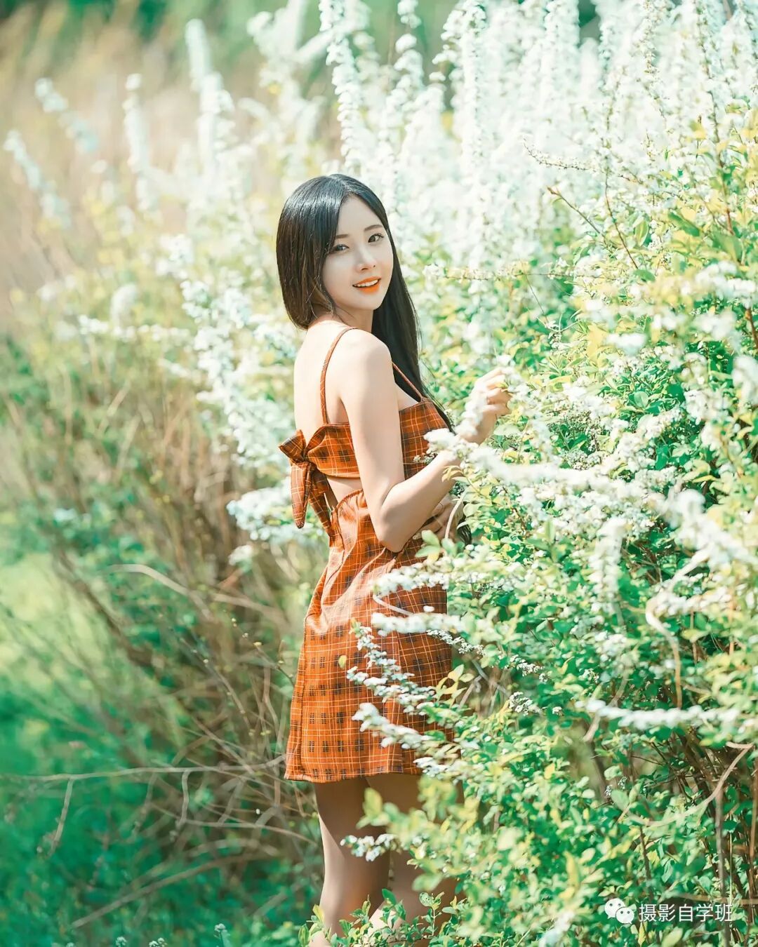 首先一定要注意衣着的颜色,衣服颜色,要与整体环境,有明显区别,这样画面中的人,才能够更被凸显出来,主体才更加突出,像上图橙色的衣服,周边都是绿色和浅色的花朵,搭配就很合适。姿势很简单,让人面对着草丛,拍一个侧身回眸的姿势,与镜头有一个互动,这样姿势不尴尬,表情又自然。还可以像下图这样,让一些枝条遮挡住镜头,形成虚化的前景,拍摄的时候,一定要避开晴天正午,因为那个时间段,阳光太强会让脸部过曝,没有细节,而清晨和傍晚,光线更加柔和,面部光线,更加均匀。姿势上,一个手拽着枝条,另一个手,搭到锁骨处就很漂亮了。