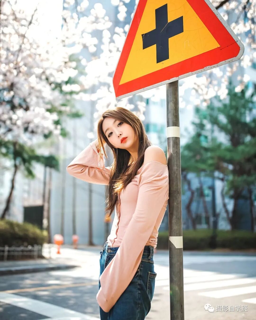 路边拍照很简单,我们可以随便找一个路牌,站在路牌下,靠在路牌上,可以像上图一样,两个手自然下垂,歪着头看向镜头。还可以一个手自然下垂,另一个手伸到脑后,适当抬起下巴,这样同一场景,能拍出多种不同的姿势。而依靠在标志杆上,又显得自然放松,很随意,不做作。