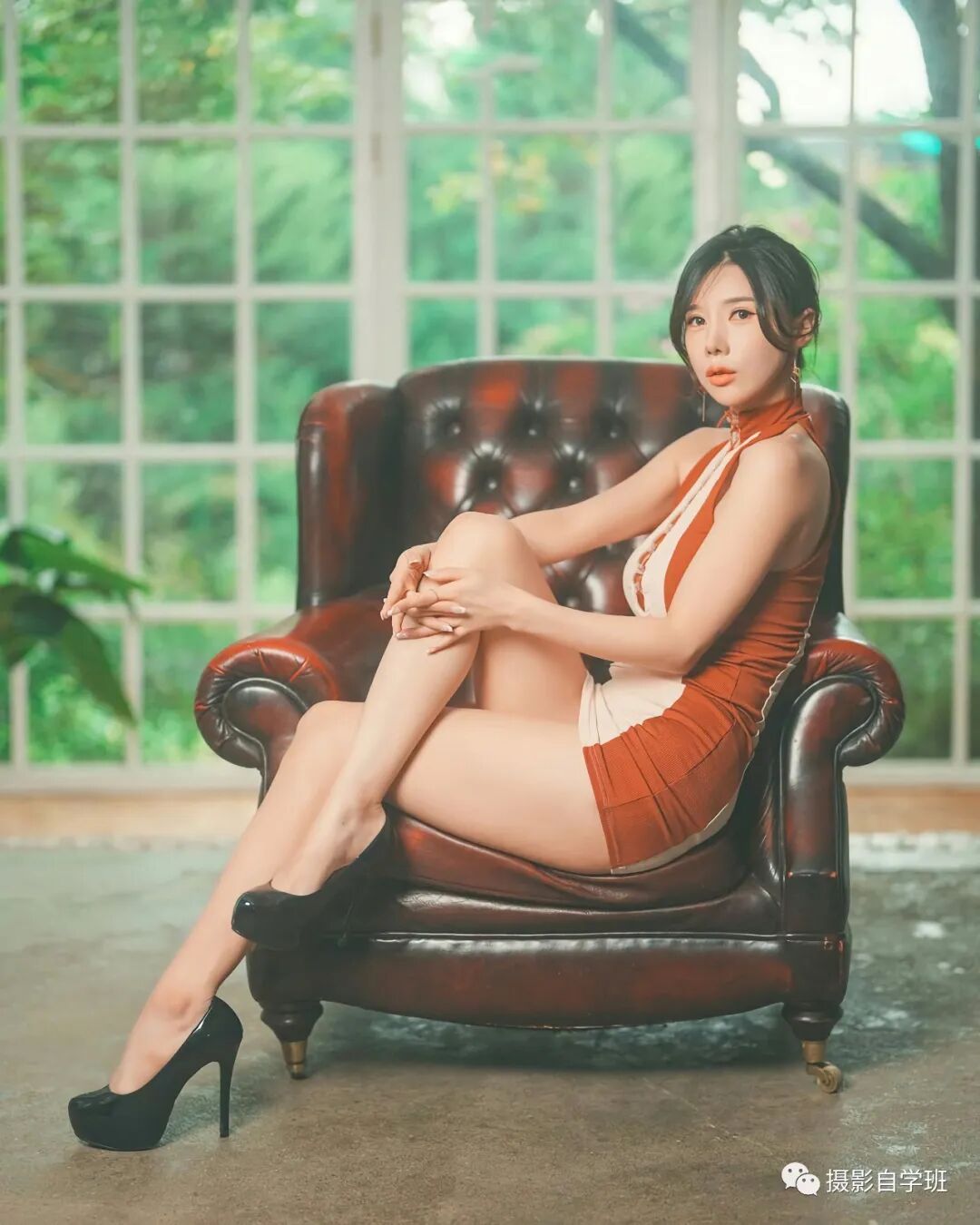 如果拍摄坐姿要注意,像上图一样,两条腿最好一高,一低不要完全重合,这样能够体现出身体的立体感,与曲线美。在家中室内拍摄,可以坐在沙发上,侧身面对镜头。侧身的情况下,可以让体型优美,同时侧脸面对镜头,脸就不会显得很平,会更加立体,照片就会更好看了。
