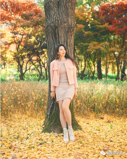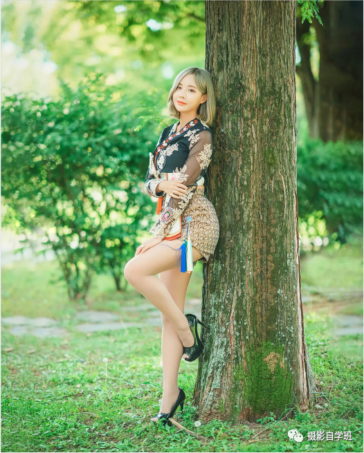 在生活当中,遇到上图这样的大树,不要像上面这张照片一样,让被拍摄的人靠在大树上,正对着她拍。虽然把腿翘了起来,但是弯曲的腿直对着镜头,也没有体现出曲线的美。而像下图这样,让人靠在大树上,拍一个侧身照片,一只腿翘起来,就能够体现出曲线美了。