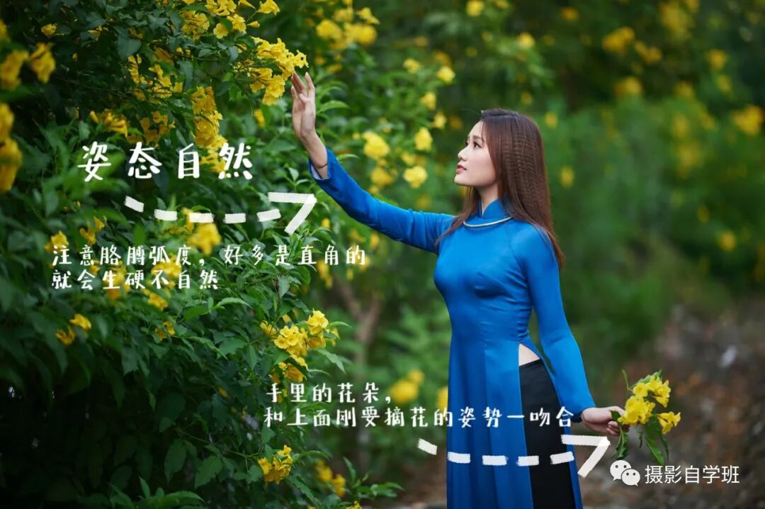 姿态自然是我们拍摄的时候,追求的方向,上图中右手轻轻抬起,似乎要摘花的样子,胳膊肘的位置,没有生硬的直角弯,所以看着很自然不生硬,另外左手的花朵与整体画面,没有违和感。轻松又自然。我们来看看僵硬的肢体是什么样的,如下图: