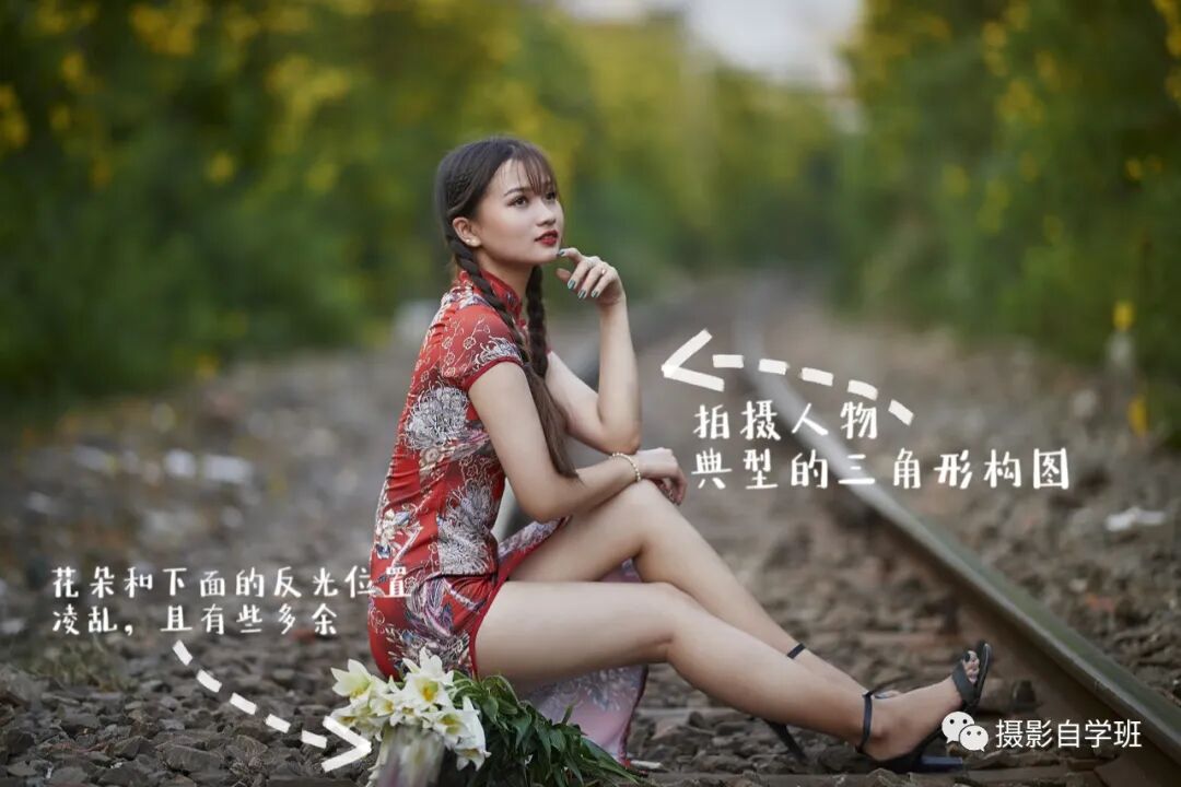 人物选择坐在地上,肢体呈现打开的状态,形成一个典型的三角形构图,稳稳地占据了画面的中心位置,同时也抓住了观者的眼球。但画面唯有一处不足的地方,在画面花朵出,花朵的姿态和下面的反光有些乱,而且花朵和整体也有些不配套,可以完全不用花朵。